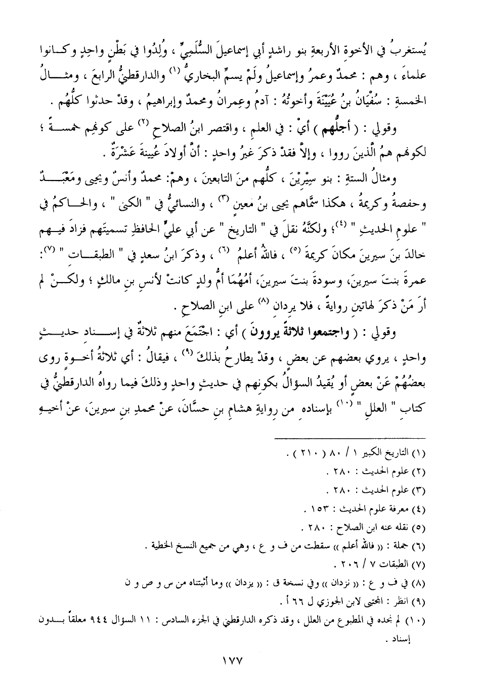 وقولي واجتمعوا ثلاثةً يروونَ أي اجْتَمَعَ منهم ثلاثةٌ في إسنادِ حديثٍ واحدٍ، يروي بعضهم عن بعضٍ، وقدْ يطارحُ بذلكَ، فيقالُ أي ثلاثةُ أخوةٍ روى بعضُهُمْ عَنْ بعضٍ أو يُقيدُ السؤالُ بكونِهم في حديثٍ واحدٍ وذلكَ فيما رواهُ الدارقطنيُّ في كتابِ العللِ بإسنادهِ من رِوايةِ هشامِ بنِ حسَّانَ، عنْ محمدِ بنِ سيرينَ، عنْ أخيهِ يحيى بنِ سيرينَ، عنْ أخيهِ أنسِ بنِ سيرينَ، عنْ أنسِ بنِ مالكٍ، أنَّ رسولَ اللهِ - صَلَّى اللهُ عَلَيْهِ وَسَلَّمَ - قالَ لَبَّيْكَ حَجَّاً حقَّاً تَعَبُّداً وَرِقّاً وذكرَ محمدُ بنُ طاهرٍ المقدسيُّ في بعضِ تخاريجهِ أنَّ هذا الحديثَ رواهُ محمدُ بنُ سيرينَ عنْ أخيهِ