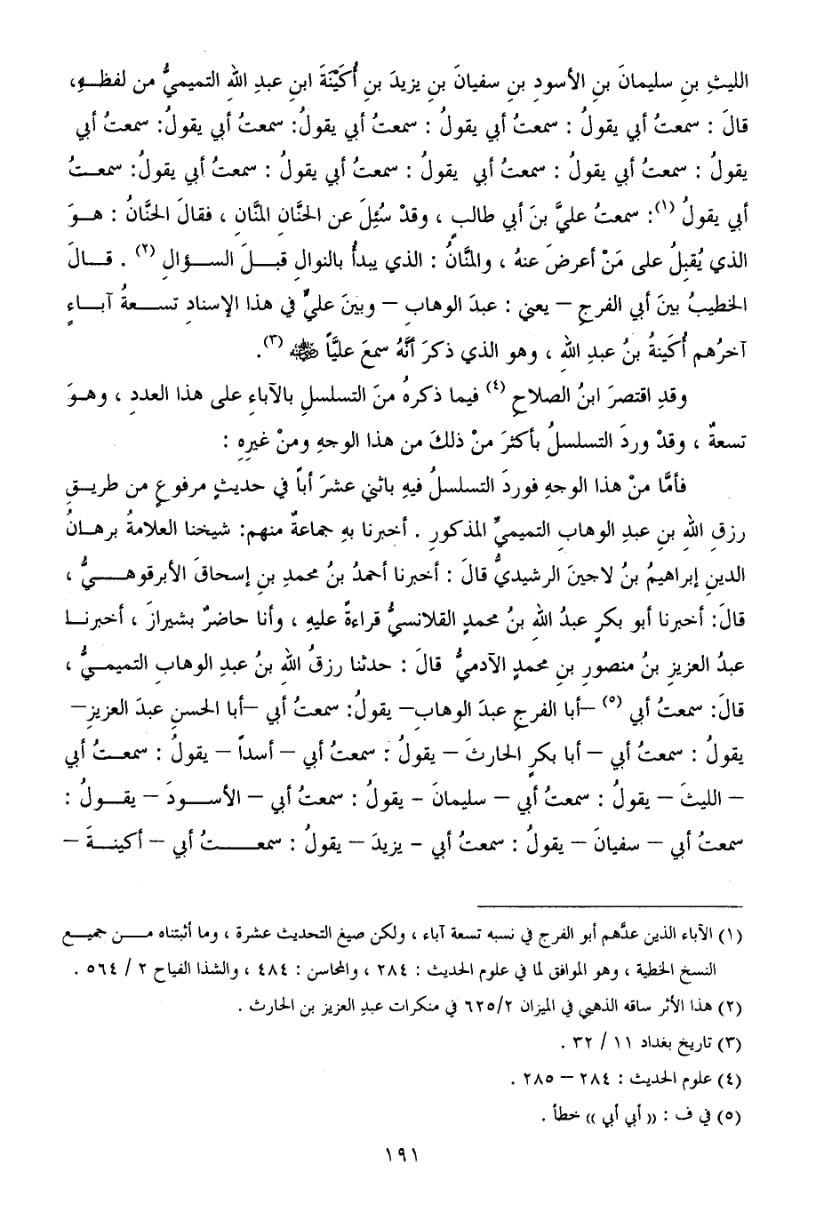 الليثِ بنِ سليمانَ بنِ الأسودِ بنِ سفيانَ بنِ يزيدَ بنِ أُكَيْنَةَ ابنِ عبدِ اللهِ التميميُّ من لفظهِ، قالَ: سمعتُ أبي يقولُ: سمعتُ أبي يقولُ: سمعتُ أبي يقولُ: سمعتُ أبي يقولُ: سمعتُ أبي يقولُ: سمعتُ أبي يقولُ: سمعتُ أبي يقولُ: سمعتُ أبي يقولُ: سمعتُ أبي يقولُ: سمعتُ أبي يقولُ: سمعتُ عليَّ بنَ أبي طالبٍ، وقدْ سُئِلَ عن الحنَّانِ المنَّانِ، فقالَ الحنَّانُ: هوَ الذي يُقبِلُ على مَنْ أعرضَ عنهُ، والمنَّانُ: الذي يبدأُ بالنوالِ قبلَ السؤالِ. قالَ الخطيبُ بينَ أبي الفرجِ - يعني: عبدَ الوهابِ - وبينَ عليٍّ في هذا الإسنادِ تسعةُ آباءٍ آخرُهم أُكَينةُ بنُ عبدِ اللهِ، وهو الذي ذكرَ أنَّهُ سمعَ عليَّاً - رضي الله عنه -.