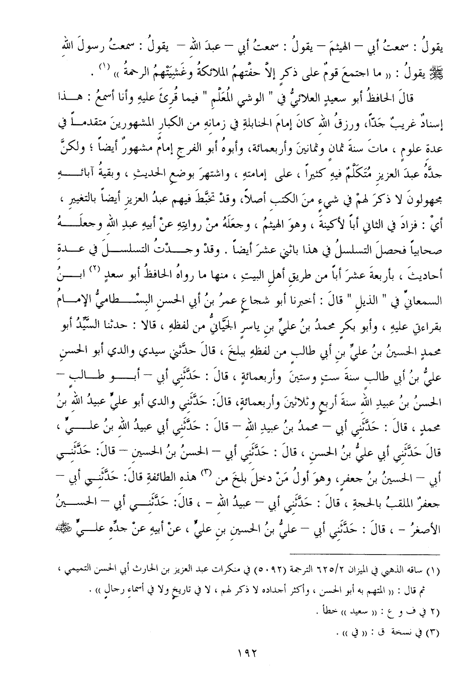 وقدْ وجدْتُ التسلسلَ في عدةِ أحاديثَ، بأربعةَ عشرَ أباً من طريقِ أهلِ البيتِ، منها ما رواهُ الحافظُ أبو سعدٍ ابنُ السمعانيِّ في " الذيلِ " قالَ: أخبرنا أبو شجاعٍ عمرُ بنُ أبي الحسنِ البِسْطاميُّ الإمامُ بقراءتي عليهِ، وأبو بكرٍ محمدُ بنُ عليِّ بنِ ياسرٍ الجَيَّانيُّ من لفظهِ، قالا: حدثنا السَّيِّدُ أبو محمدٍ الحسينُ بنُ عليِّ بنِ أبي طالبٍ من لفظهِ ببلخَ، قالَ حدَّثني سيدي والدي أبو الحسنِ عليُّ بنُ أبي طالبٍ سنةَ ستٍ وستينَ وأربعمائةٍ، قالَ: حَدَّثَنِي أبي - أبو طالبٍ - الحسنُ بنُ عبيدِ اللهِ سنةَ أربعٍ وثلاثينَ وأربعمائةٍ، قالَ: حَدَّثَنِي والدي أبو عليٍّ عبيدُ اللهِ بنُ محمدٍ، قالَ: حَدَّثَنِي أبي - محمدُ بنُ عبيدِ اللهِ - قالَ: حَدَّثَنِي أبي عبيدُ اللهِ بنُ عليٍّ، قالَ حَدَّثَنِي أبي عليُّ بنُ الحسنِ، قالَ: حَدَّثَنِي أبي - الحسنُ بنُ الحسينِ - قالَ: حَدَّثَنِي أبي - الحسينُ بنُ جعفرٍ، وهوَ أولُ مَنْ دخلَ بلخَ من هذهِ الطائفةِ قالَ: حَدَّثَنِي أبي - جعفرٌ الملقبُ بالحجةِ، قالَ: حَدَّثَنِي أبي - عبيدُ اللهِ -، قالَ: حَدَّثَنِي أبي - الحسينُ الأصغرُ -، قالَ: حَدَّثَنِي أبي - عليُّ بنُ الحسينِ بنِ عليٍّ، عنْ أبيهِ عنْ جدِّهِ عليٍّ - رضي الله عنه -