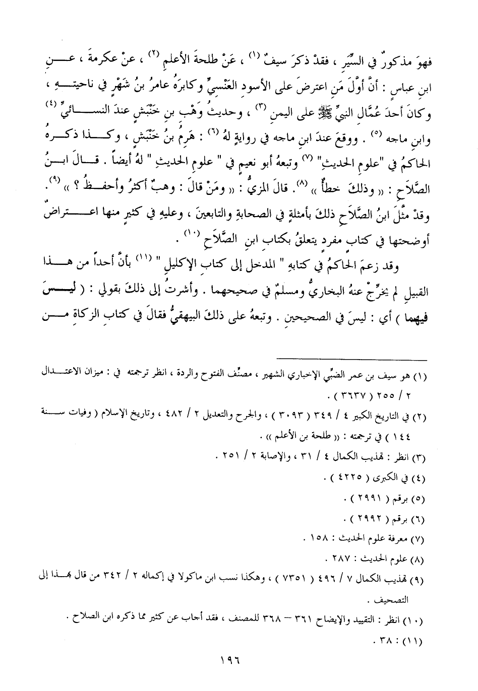 وقد زعمَ الحاكمُ في كتابهِ " المدخل إلى كتابِ الإكليلِ " بأنَّ أحداً من هذا القبيلِ لم يخرِّجْ عنهُ البخاريُّ ومسلمٌ في صحيحهما. وأشرتُ إلى ذلكَ بقولي: (ليسَ فيهما) أي: ليسَ في الصحيحينِ. وتبعهُ على ذلكَ البيهقيُّ فقالَ في كتابِ الزكاةِ من "