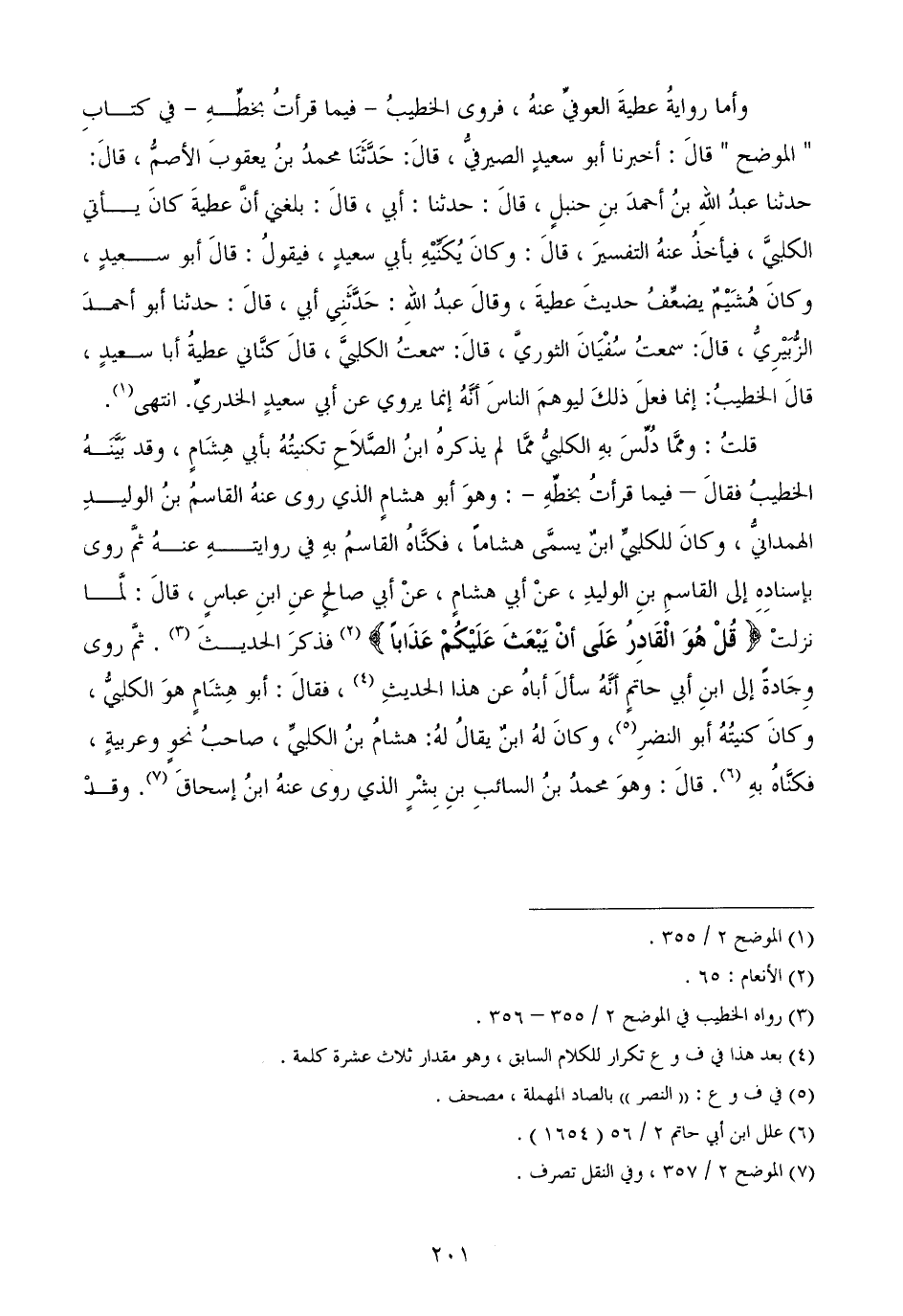 " الموضح " قالَ: أخبرنا أبو سعيدٍ الصيرفيُّ، قالَ: حَدَّثَنَا محمدُ بنُ يعقوبَ الأصمُّ، قالَ: حدثنا عبدُ اللهِ بنُ أحمدَ بنِ حنبلٍ، قالَ: حدثنا: أبي، قالَ: بلغني أنَّ عطيةَ كانَ يأتي الكلبيَّ، فيأخذُ عنهُ التفسيرَ، قالَ: وكانَ يُكَنِّيْهِ بأبي سعيدٍ، فيقولُ: قالَ أبو سعيدٍ، وكانَ هُشَيْمٌ يضعِّفُ حديثَ عطيةَ، وقالَ عبدُ اللهِ: حَدَّثَنِي أبي، قالَ: حدثنا أبو أحمدَ الزُّبَيْرِيُّ، قالَ: سمعتُ سُفْيَانَ الثوريَّ، قالَ: سمعتُ الكلبيَّ، قالَ كنَّاني عطيةُ أبا سعيدٍ، قالَ الخطيبُ: إنما فعلَ ذلكَ ليوهمَ الناسَ أنَّهُ إنما يروي عن أبي سعيدٍ الخدريِّ. انتهى.