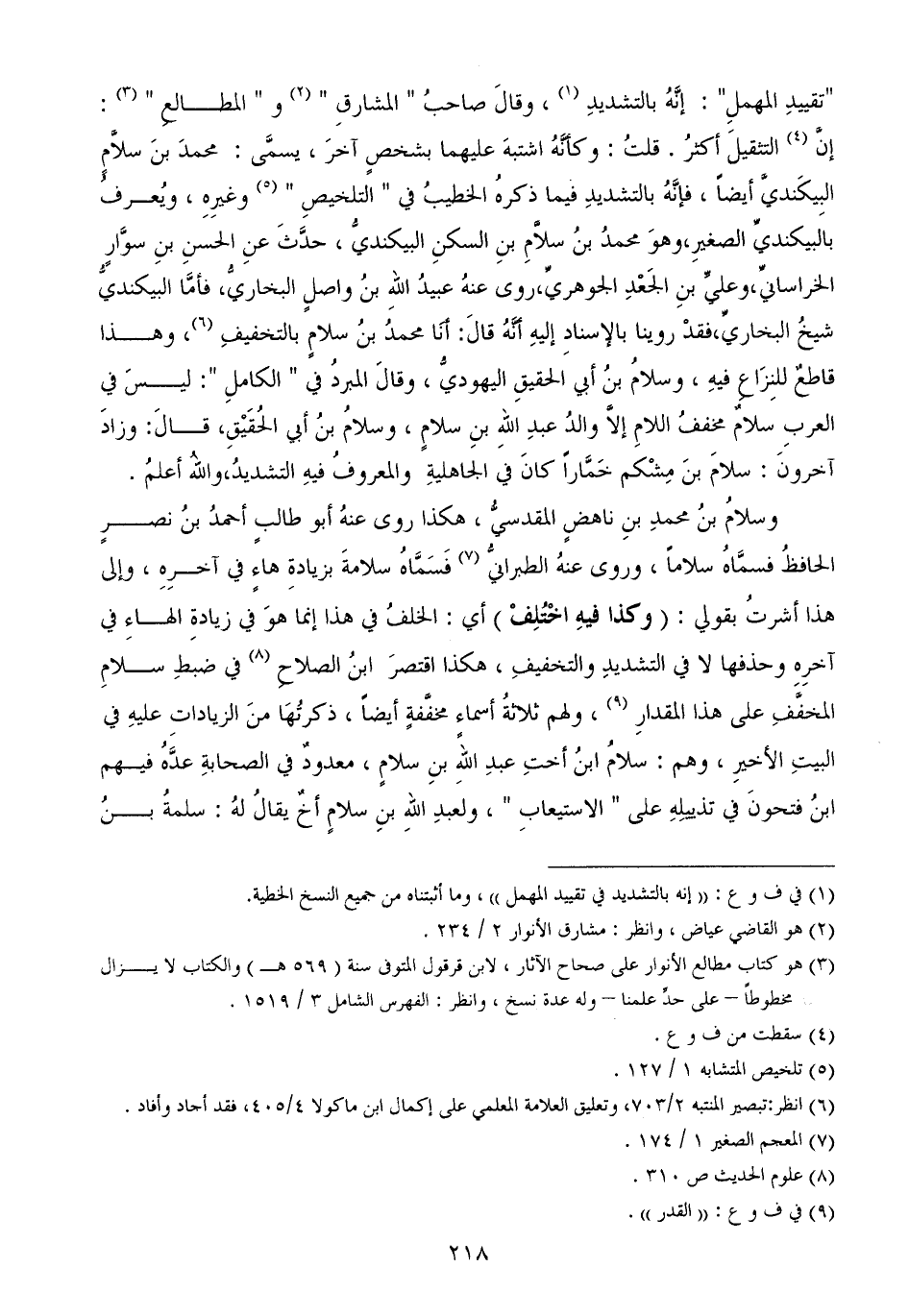 "تقييدِ المهملِ": إنَّهُ بالتشديدِ، وقالَ صاحبُ " المشارقِ "و " المطالعِ ": إنَّالتثقيلَ أكثرُ. قلتُ: وكأنَّهُ اشتبهَ عليهما بشخصٍ آخرَ، يسمَّى: محمدَ بنَ سلاَّمٍ البِيكَنديَّ أيضاً، فإنَّهُ بالتشديدِ فيما ذكرهُ الخطيبُ في " التلخيصِ "وغيرِهِ، ويُعرفُ بالبيكنديِّ الصغيرِ، وهوَ محمدُ بنُ سلاَّمِ بنِ السكنِ البيكنديُّ، حدَّثَ عنِ الحسنِ بنِ سوَّارٍ الخراسانيِّ، وعليِّ بنِ الجَعْدِ الجوهريِّ، روى عنهُ عبيدُ اللهِ بنُ واصلٍ البخاريُّ، فأمَّا البيكنديُّ شيخُ البخاريِّ، فقدْ روينا بالإسنادِ إليهِ أنَّهُ قالَ: أنَا محمدُ بنُ سلامٍ بالتخفيفِ، وهذا قاطعٌ للنِزَاعِ فيهِ، وسلامُ بنُ أبي الحقيقِ اليهوديُّ، وقالَ المبردُ في " الكاملِ ": ليسَ في العربِ سلامٌ مخففُ اللامِ إلاَّ والدُ عبدِ اللهِ بنِ سلامٍ، وسلامُ بنُ أبي الحُقَيْقِ، قالَ: وزادَ آخرونَ: سلامَ بنَ مِشْكم خَمَّاراً كانَ في الجاهليةِوالمعروفُ فيهِ التشديدُ، واللهُ أعلمُ.
