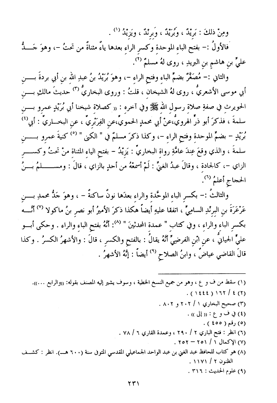 والثاني: - مُصَغَّرٌ بضمِّ الباءِ وفتحِ الراءِ -، وهوَ بُرَيْدُ بنُ عبدِ اللهِ بنِ أبي بردةَ بنِ أبي موسى الأشعريُّ، روى لهُ الشيخانِ، قلتُ: وروى البخاريُّحديثَ مالكِ بنِ الحويرثِ في صفةِ صلاةِ رسولِ اللهِ - صَلَّى اللهُ عَلَيْهِ وَسَلَّمَ - وفي آخرهِ: ((كصلاةِ شيخنا أبي بُرَيْدٍ عمرِو بنِ سلمةَ، فذكرَ أبو ذرٍّ الهرويُّ، عنْ أبي محمدٍ الحمويِّ، عنِ الفِرَبْرِيِّ، عنِ البخاريِّ: أبي بُرَيْدٍ - بضمِّ الموحدةِ وفتحِ الراءِ -، وكذا ذكرَ مسلمٌ في " الكنى "كنيةَ عمرِو بنِ سلمةَ، والذي وقعَ عِندَ عامَّةِ رواةِ البخاريِّ: يَزِيْدُ - بفتحِ الياءِ المثناةِ منْ تحتُ وكسرِ الزاي -، كالجادةِ، وقالَ عبدُ الغنيِّ: لَمْ أسمعْهُ من أحدٍ بالزاي، قالَ: ومسلمُ بنُ الحجاجِ أعلمُ.