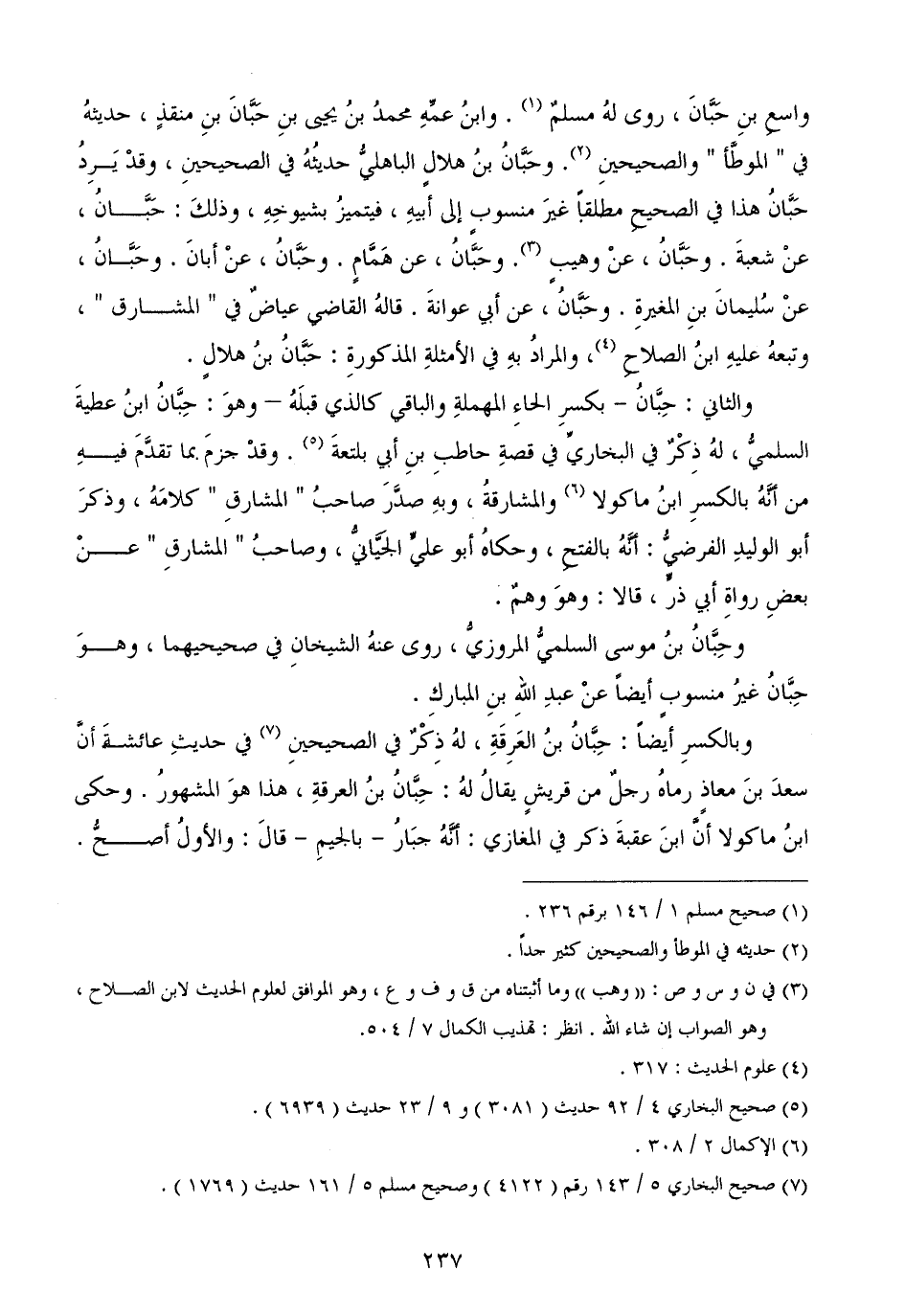 واسعِ بنِ حَبَّانَ، روى لهُ مسلمٌ. وابنُ عمِّهِ محمدُ بنُ يحيى بنِ حَبَّانَ بنِ منقذٍ، حديثهُ في " الموطَّأ " والصحيحينِ. وحَبَّانُ بنُ هلالٍ الباهليُّ حديثُهُ في الصحيحينِ، وقدْ يَرِدُ حَبَّانُ هذا في الصحيحِ مطلقاً غيرَ منسوبٍ إلى أبيهِ، فيتميزُ بشيوخِهِ، وذلكَ: حَبَّانُ، عنْ شعبةَ. وحَبَّانُ، عنْ وهيبٍ. وحَبَّانُ، عن هَمَّامٍ. وحَبَّانُ، عنْ أبانَ. وحَبَّانُ، عنْ سُليمانَ بنِ المغيرةِ. وحَبَّانُ، عن أبي عوانةَ. قالهُ القاضي عياضٌ في " المشارق "، وتبعهُ عليهِ ابنُ الصلاحِ، والمرادُ بهِ في الأمثلةِ المذكورةِ: حَبَّانُ بنُ هلالٍ.