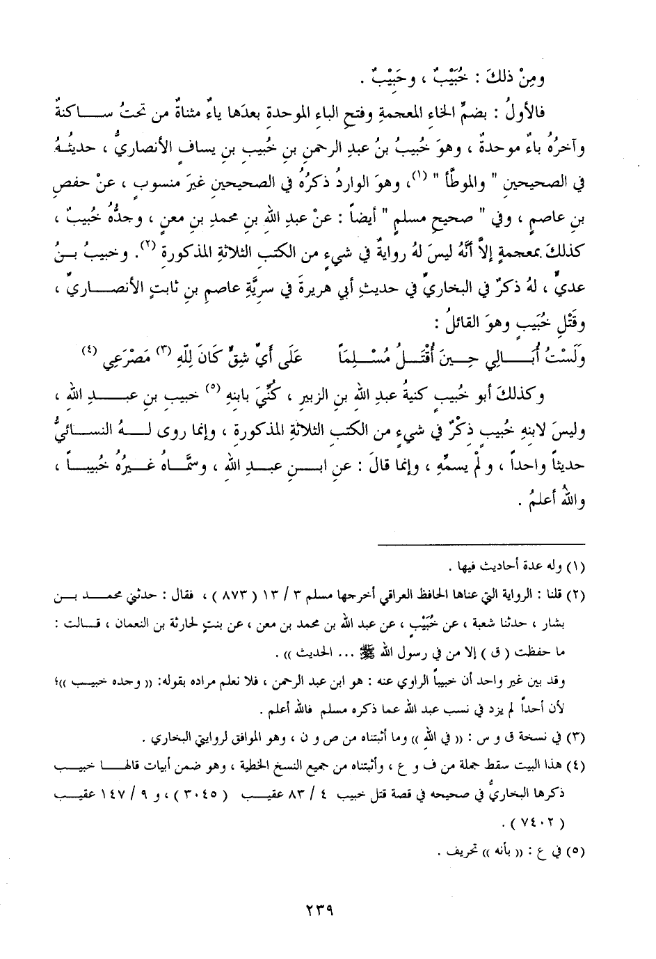 فالأولُ: بضمِّ الخاءِ المعجمةِ وفتحِ الباءِ الموحدةِ بعدَها ياءٌ مثناةٌ من تحتُ ساكنةٌ وآخرُهُ باءٌ موحدةٌ، وهوَ خُبيبُ بنُ عبدِ الرحمنِ بنِ خُبيبِ بنِ يسافٍ الأنصاريُّ، حديثُهُ في الصحيحينِ " والموطَّأ "، وهوَ الواردُ ذكرُهُ في الصحيحينِ غيرَ منسوبٍ، عنْ حفصِ بنِ عاصمٍ، وفي " صحيحِ مسلمٍ " أيضاً: عنْ عبدِ اللهِ بنِ محمدِ بنِ معنٍ، وجدُّهُ خُبيبٌ، كذلكَ بمعجمةٍ إلاَّ أنَّهُ ليسَ لهُ روايةٌ في شيءٍ من الكتبِ الثلاثةِ المذكورةِ. وخبيبُ بنُ عديٍّ، لهُ ذكرٌ في البخاريِّ في حديثِ أبي هريرةَ في سرِيَّةِ عاصمِ بنِ ثابتٍ الأنصاريِّ، وقَتْلِ خُبَيبٍ وهوَ القائلُ: