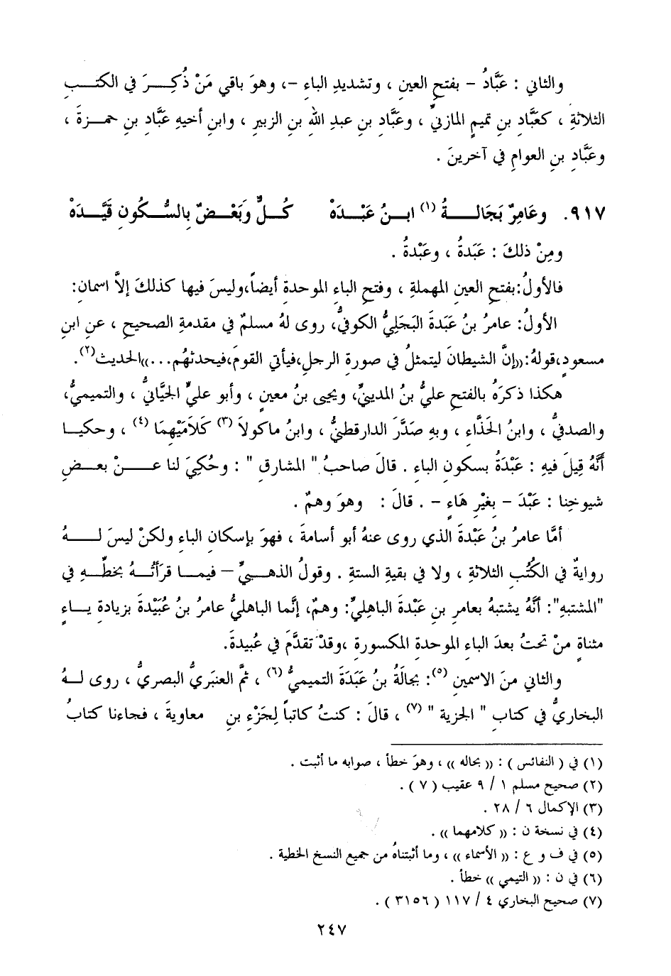 أمَّا عامرُ بنُ عَبْدةَ الذي روى عنهُ أبو أسامةَ، فهوَ بإسكانِ الباءِ ولكنْ ليسَ لهُ روايةٌ في الكُتُبِ الثلاثةِ، ولا في بقيةِ الستةِ. وقولُ الذهبيِّ - فيما قرَأتُهُ بخطِّهِ في "المشتبهِ": أنَّهُ يشتبهُ بعامرِ بنِ عَبْدةَ الباهِليِّ: وهمٌ، إنَّما الباهليُّ عامرُ بنُ عُبَيْدةَ بزيادةِ ياءٍ مثناةٍ منْ تحتُ بعدَ الباءِ الموحدةِ المكسورةِ، وقدْ تقدَّمَ في عُبيدةَ.