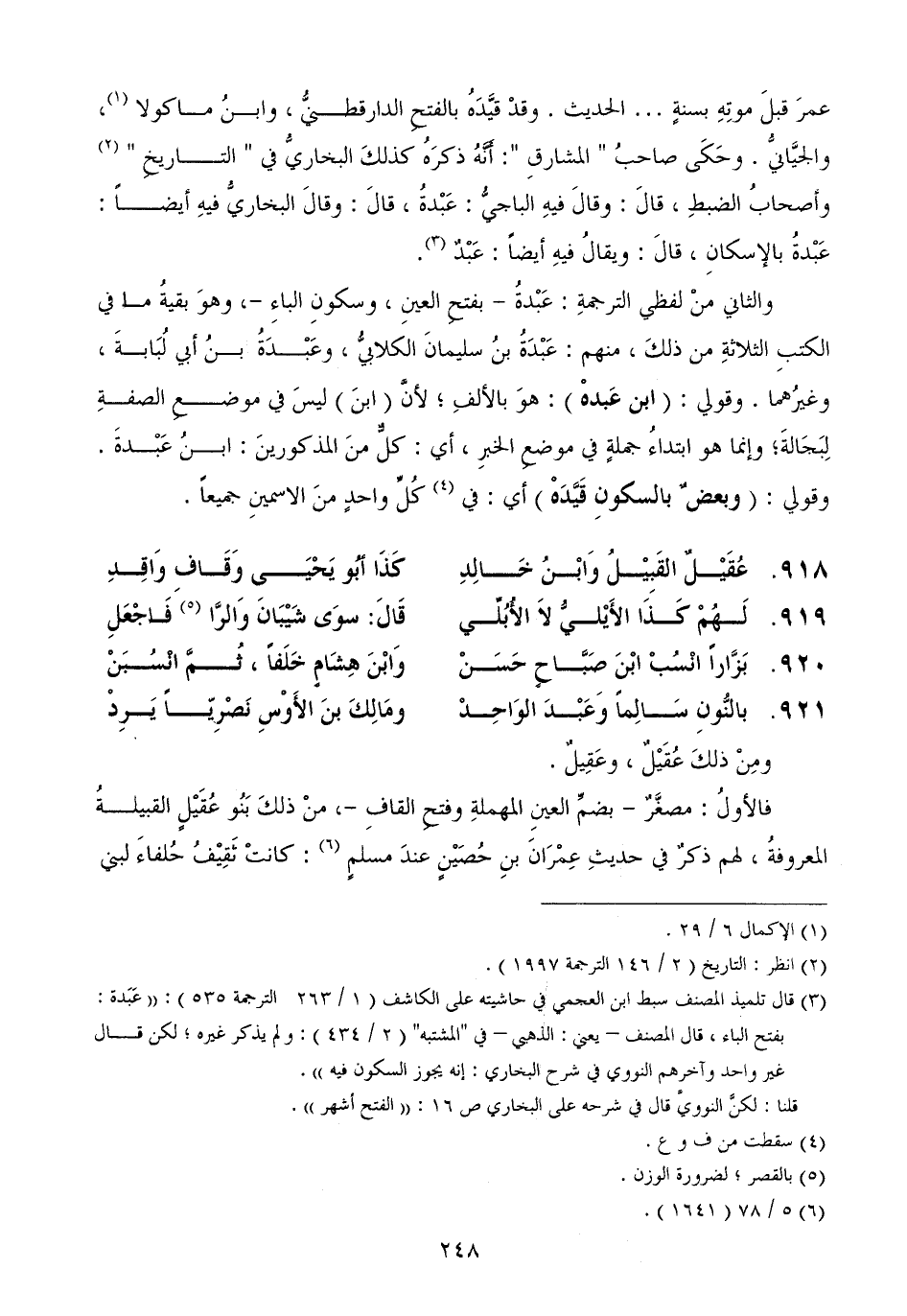عمرَ قبلَ موتِهِ بسنةٍ ... الحديث. وقدْ قيَّدَهُ بالفتحِ الدارقطنيُّ، وابنُ ماكولا، والجيَّانيُّ. وحَكَى صاحبُ " المشارقِ ": أَنَّهُ ذكرَهُ كذلكَ البخاريُّ في " التاريخِ " وأصحابُ الضبطِ، قالَ: وقالَ فيهِ الباجيُّ: عَبْدةُ، قالَ: وقالَ البخاريُّ فيهِ أيضاً: عَبْدةُ بالإسكانِ، قالَ: ويقالُ فيهِ أيضاً: عَبْدٌ.