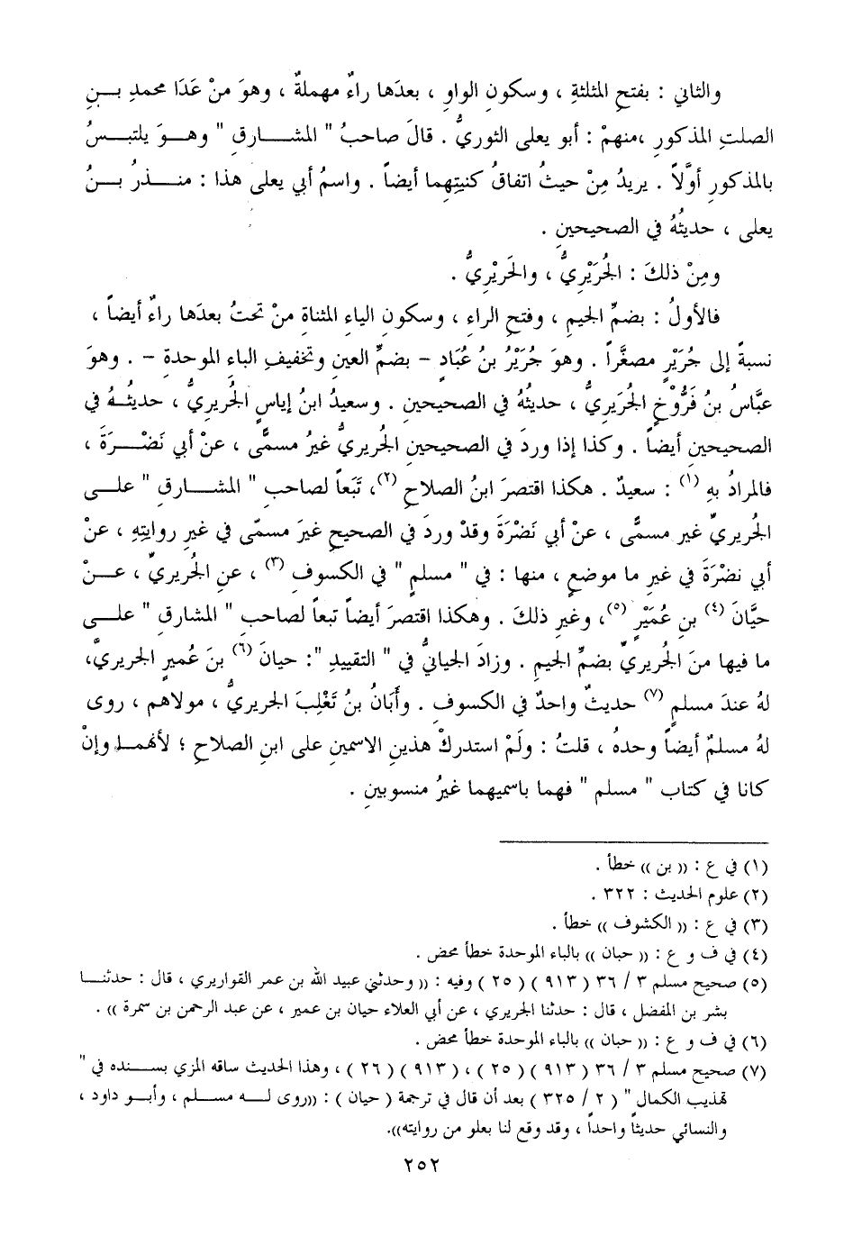 هكذا اقتصرَ أيضاً تبعاً لصاحبِ " المشارقِ " على ما فيها منَ الجُريريِّ بضمِّ الجيمِ. وزادَ الجيانيُّ في " التقييدِ ": حيانَ بنَ عُميرٍ الجريريَّ، لهُ عندَ مسلمٍ حديثٌ واحدٌ في الكسوفِ. وأَبَانُ بنُ تَغْلِبَ الجريريُّ، مولاهم، روى لهُ مسلمٌ أيضاً وحدهُ، قلتُ: ولَمْ استدركْ هذينِ الاسمينِ على ابنِ الصلاحِ؛ لأنهما وإنْ كانا في كتاب " مسلم " فهما باسميهما غيرُ منسوبينِ.