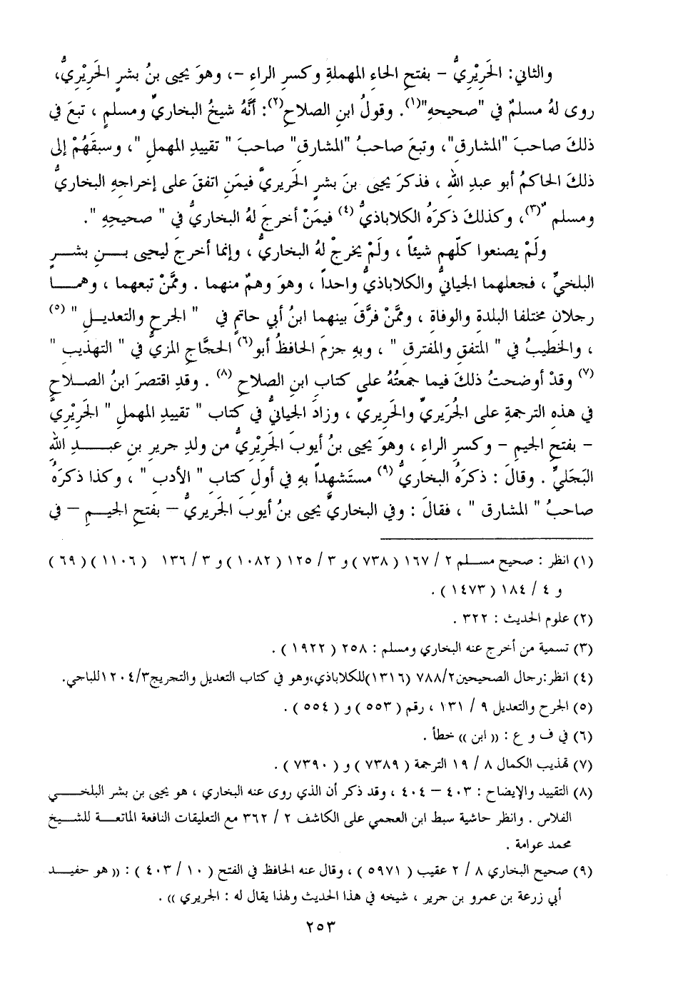 ولَمْ يصنعوا كلّهم شيئاً، ولَمْ يخرجْ لهُ البخاريُّ، وإنما أخرجَ ليحيى بنِ بشرٍ البلخيِّ، فجعلهما الجيانيُّ والكلاباذيُّ واحداً، وهوَ وهمٌ منهما. وممَّنْ تبعهما، وهما رجلانِ مختلفا البلدةِ والوفاةِ، وممَّنْ فرَّقَ بينهما ابنُ أبي حاتمٍ في " الجرحِ والتعديلِ "، والخطيبُ في " المتفقِ والمفترقِ "، وبهِ جزمَ الحافظُ أبو الحجَّاجِ المزيُّ في " التهذيبِ " وقدْ أوضحتُ ذلكَ فيما جمعتُهُ على كتابِ ابنِ الصلاحِ. وقدِ اقتصرَ ابنُ الصلاحِ في هذهِ الترجمةِ على الجُرَيريِّ والحَرِيريِّ، وزادَ الجيانيُّ في كتاب " تقييدِ المهملِ " الجَرِيْرِيَّ - بفتحِ الجيمِ - وكسرِ الراءِ، وهوَ يحيى بنُ أيوبَ الجَرِيْرِيُّ من ولدِ جريرِ بنِ عبدِ اللهِ البَجَليِّ. وقالَ: ذكرَهُ البخاريُّ مستَشهِداً بهِ في أولِ كتابِ " الأدبِ "، وكذا ذكرَهُ صاحبُ " المشارق "، فقالَ: وفي البخاريِّ يحيى بنُ أيوبَ الجَريريُّ - بفتحِ الجيمِ - في