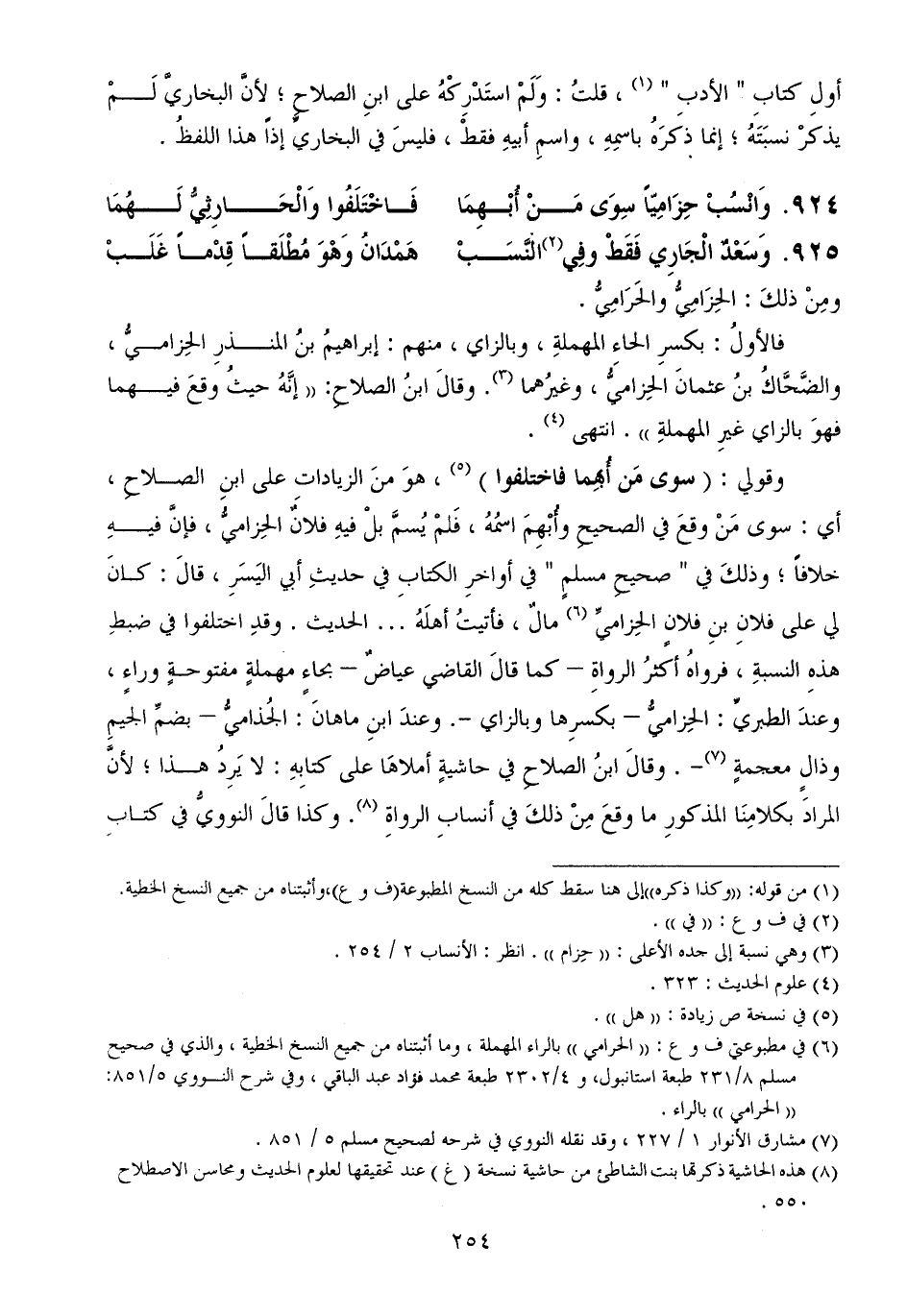 وقولي: (سوى مَن أُبهِما فاختلفوا) ، هوَ منَ الزياداتِ على ابنِ الصلاحِ، أي: سوى مَنْ وقعَ في الصحيحِ وأُبْهِمَ اسمُهُ، فَلمْ يُسمَّ بلْ فيهِ فلانٌ الحِزاميُّ، فإنَّ فيهِ خلافاً؛ وذلكَ في " صحيحِ مسلمٍ " في أواخرِ الكتابِ في حديثِ أبي اليَسَرِ، قالَ: كانَ لي على فلانِ بنِ فلانٍ الحِزاميِّ مالٌ، فأتيتُ أهلَهُ ... الحديث. وقدِ اختلفوا في ضبطِ هذهِ النسبةِ، فرواهُ أكثرُ الرواةِ - كما قالَ القاضي عياضٌ - بحاءٍ مهملةٍ مفتوحةٍ وراءٍ، وعندَ الطبريِّ: الحِزاميُّ - بكسرِها وبالزاي -. وعندَ ابنِ ماهانَ: الجُذاميُّ - بضمِّ الجيمِ وذالٍ معجمةٍ -. وقالَ ابنُ الصلاحِ في حاشيةٍ أملاهَا على كتابِهِ: لا يَرِدُ هذا؛ لأنَّ المرادَ بكلامِنَا المذكورِ ما وقعَ مِنْ ذلكَ في أنسابِ الرواةِ. وكذا قالَ النوويُّ في كتابِ