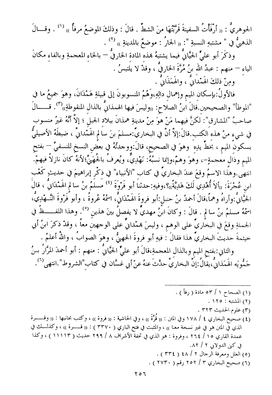 فالأولُ: بإسكانِ الميمِ وإهمالِ دالِهِ، وَهُمُ المنسوبونَ إلى قبيلةِ هَمْدَانَ، وهوَ جميعُ ما في "الموطأ" والصحيحينِ. قالَ ابنُ الصلاحِ: ((وليسَ فيها الهمذانيُّ بالذالِ المنقوطةِ)) . قالَ صاحبُ "المشارقِ": لكنَّ فيهما مَنْ هوَ مِنْ مدينةِ همذانَ ببلادِ الجبلِ؛ إلاَّ أنَّهُ غيرُ منسوبٍ في شيءٍ منْ هذهِ الكتبِ. قالَ: إلاَّ أنَّ في البخاريِّ: مسلمَ بنَ سالمٍ الهَمْدانيَّ، ضبطَهُ الأصيليُّ بسكونِ الميمِ، بخطِّ يدِهِ وهوَ في الصحيحِ، قالَ: ووجدتُهُ في بعضِ النسخِ للنسفيِّ - بفتحِ الميمِ وذالٍ معجمةٍ-، وهوَ وهمٌ، وإنما نسبُهُ: نَهْدِيٌّ، ويُعرفُ بالجُهَنيِّ؛ لأنهُ كانَ نازلاً فيهمْ. انتهى. وهذا الاسمُ وقعَ عندَ البخاريِّ في كتابِ "الأنبياء" في ذِكْرِ إبراهيمَ في حديثِ كَعْبِ ابنِ عُجْرَةَ: ((ألاَ أُهْدِي لَكَ هَدِيَّةً)) ؟، وفيهِ: حدثنا أبو فَرْوَةَ مسلمُ بنُ سالمٍ الهَمْدَانيُّ، قالَ الجيَّانيُّ: وأراهُ وهماً، قالَ أحمدُ بنُ حنبلٍ: أبو فروةَ الهَمْدَانيُّ، اسمُهُ عُروةُ، وأبو فَرْوةَ النَّهْدِيُّ، اسمُهُ مسلمُ بنُ سالمٍ. قالَ: وكانَ ابنُ مهديٍّ لا يفصلُ بينَ هذينِ. وهذا اللفظُ في الجملةِ وقعَ في البخاريِّ على الوهمِ، وليسَ بهمْدانيٍّ على الوجهينِ معاً، وقدْ ذكرَ ابنُ أبي خيثمةَ حديثَ البخاريِّ هذا فقالَ: فيهِ أبو فروةَ الجهنيُّ، وهوَ الصوابُ، واللهُ أعلمُ.
