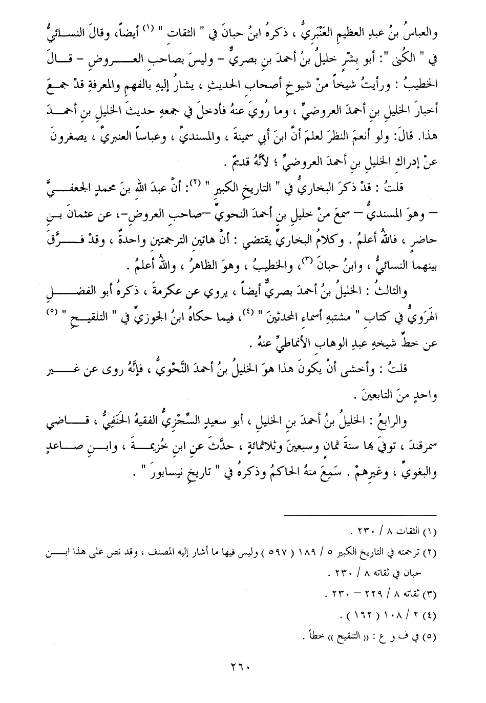 والعباسُ بنُ عبدِ العظيمِ العَنْبَرِيُّ، ذكرهُ ابنُ حبانَ في " الثقاتِ " أيضاً، وقالَ النسائيُّ في " الكُنى ": أبو بِشْرٍ خليلُ بنُ أحمدَ بنِ بصريٌّ - وليسَ بصاحبِ العروضِ - قالَ الخطيبُ: ورأيتُ شيخاً منْ شيوخِ أصحابِ الحديثِ، يشارُ إليهِ بالفهمِ والمعرفةِ قدْ جمعَ أخبارَ الخليلِ بنِ أحمدَ العروضيِّ، وما رُويَ عنهُ فأدخلَ في جمعهِ حديثَ الخليلِ بنِ أحمدَ هذا. قالَ: ولو أنعمَ النظرَ لعلمَ أنَّ ابنَ أبي سمينةَ، والمسنديَّ، وعباساً العنبريَّ، يصغرونَ عنْ إدراكِ الخليلِ بنِ أحمدَ العروضيِّ؛ لأنَّهُ قديمٌ.