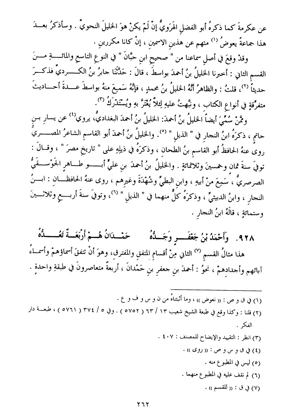 هذا مثالُ القسمِ الثاني مِنْ أقسامِ المتفقِ والمفترقِ، وهوَ أنْ تتفقَ أسماؤهمْ وأسماءُ آبائهم وأجدادِهمْ، نحوُ أحمدَ بنِ جعفرِ بنِ حَمْدانَ، أربعةٌ متعاصرونَ في طبقةِ واحدةٍ