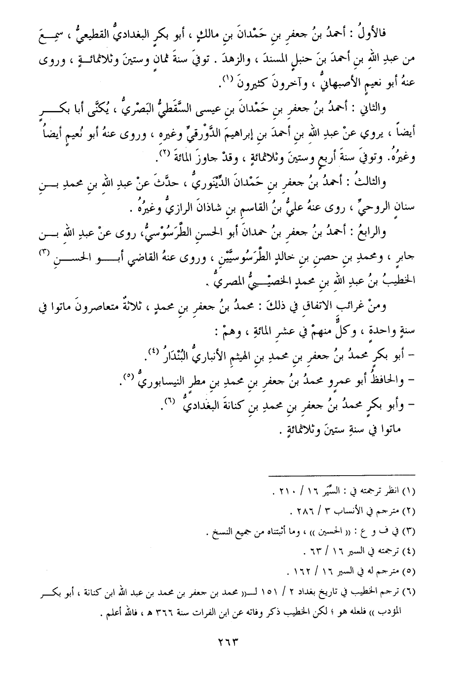 فالأولُ أحمدُ بنُ جعفرِ بنِ حَمْدانَ بنِ مالكٍ، أبو بكرٍ البغداديُّ القطيعيُّ، سمِعَ من عبدِ اللهِ بنِ أحمدَ بنَ حنبلٍ المسندَ، والزهدَ توفيَ سنةَ ثمانٍ وستينَ وثلاثمائةٍ، وروى عنهُ أبو نعيمٍ الأصبهانيُّ، وآخرونَ كثيرونَ