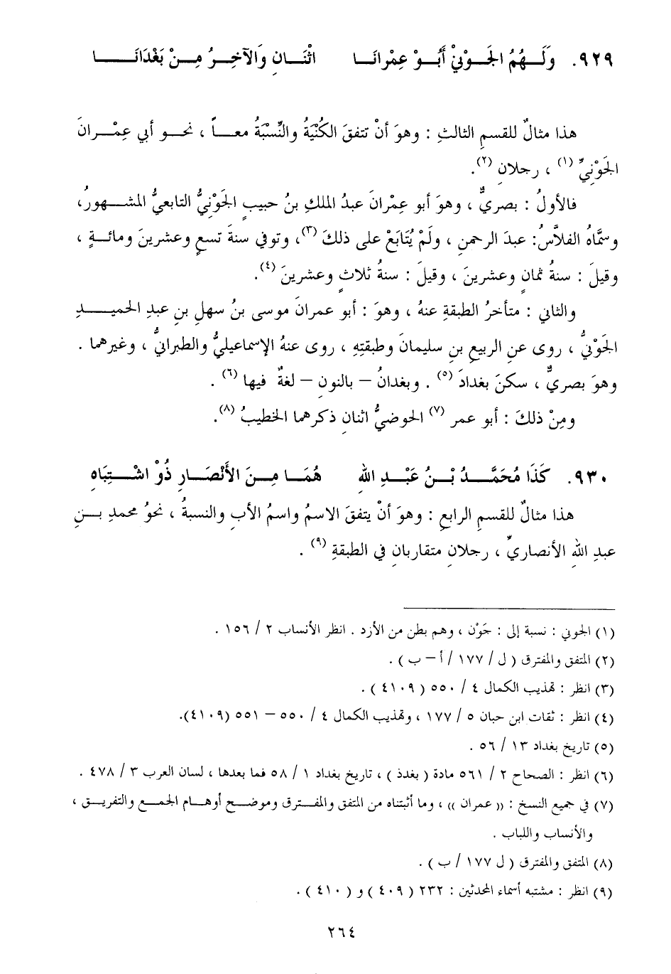 هذا مثالٌ للقسمِ الرابعِ وهوَ أنْ يتفقَ الاسمُ واسمُ الأبِ والنسبةُ، نحوُ محمدِ بنِ عبدِ اللهِ الأنصاريِّ، رجلانِ متقاربانِ في الطبقةِ