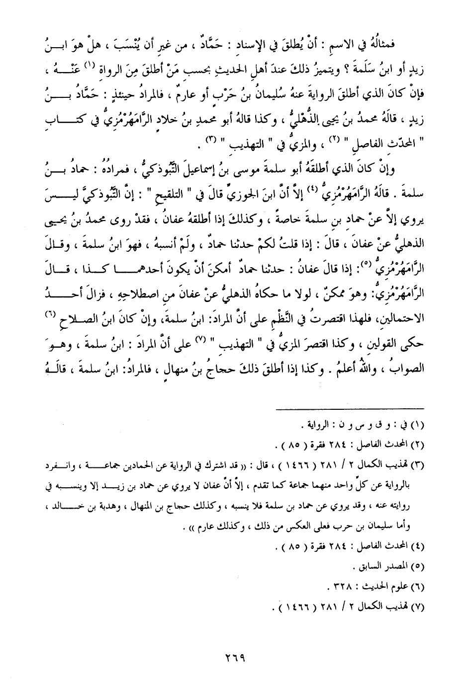 وإنْ كانَ الذي أطلقَهُ أبو سلمةَ موسى بنُ إسماعيلَ التَّبُوذكيُّ، فمرادُهُ: حمادُ بنُ سلمةَ. قالَهُ الرَّامَهُرْمُزِيُّ إلاَّ أنَّ ابنَ الجوزيِّ قالَ في " التلقيحِ ": إنَّ التَّبُوذكيَّ ليسَ يروي إلاَّ عنْ حمادِ بنِ سلمةَ خاصةً، وكذلكَ إذا أطلقهُ عفانُ، فقدْ روى محمدُ بنُ يحيى الذهليُّ عنْ عفانَ، قالَ: إذا قلتُ لكمْ حدثنا حمادٌ، ولَمْ أنسبهُ، فهوَ ابنُ سلمةَ، وقالَ الرَّامَهُرْمُزِيُّ: إذا قالَ عفانُ: حدثنا حمادٌ أمكنَ أنْ يكونَ أحدهما كذا، قالَ الرَّامَهُرْمُزِيُّ: وهوَ ممكنٌ، لولا ما حكاهُ الذهليُّ عنْ عفانَ منِ اصطلاحِهِ، فزالَ أحدُ الاحتمالينِ، فلهذا اقتصرتُ في النَّظْمِ على أنَّ المرادَ: ابنُ سلمةَ، وإنْ كانَ ابنُ الصلاحِ حكى القولينِ، وكذا اقتصرَ المزيُّ في " التهذيبِ " على أنَّ المرادَ: ابنُ سلمةَ، وهوَ الصوابُ، واللهُ أعلمُ. وكذا إذا أطلقَ ذلكَ حجاجُ بنُ منهالٍ، فالمرادُ: ابنُ سلمةَ، قالَهُ
