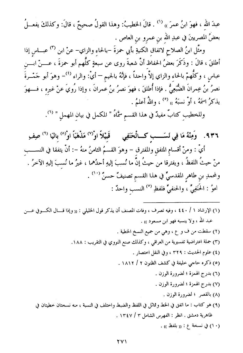 936.... وَمِنْهُ مَا فِي نَسَبٍ كالْحَنَفِي ... قَبِيْلاً اوْ مَذْهَبَاً اوْ بِاليَا صِفِ