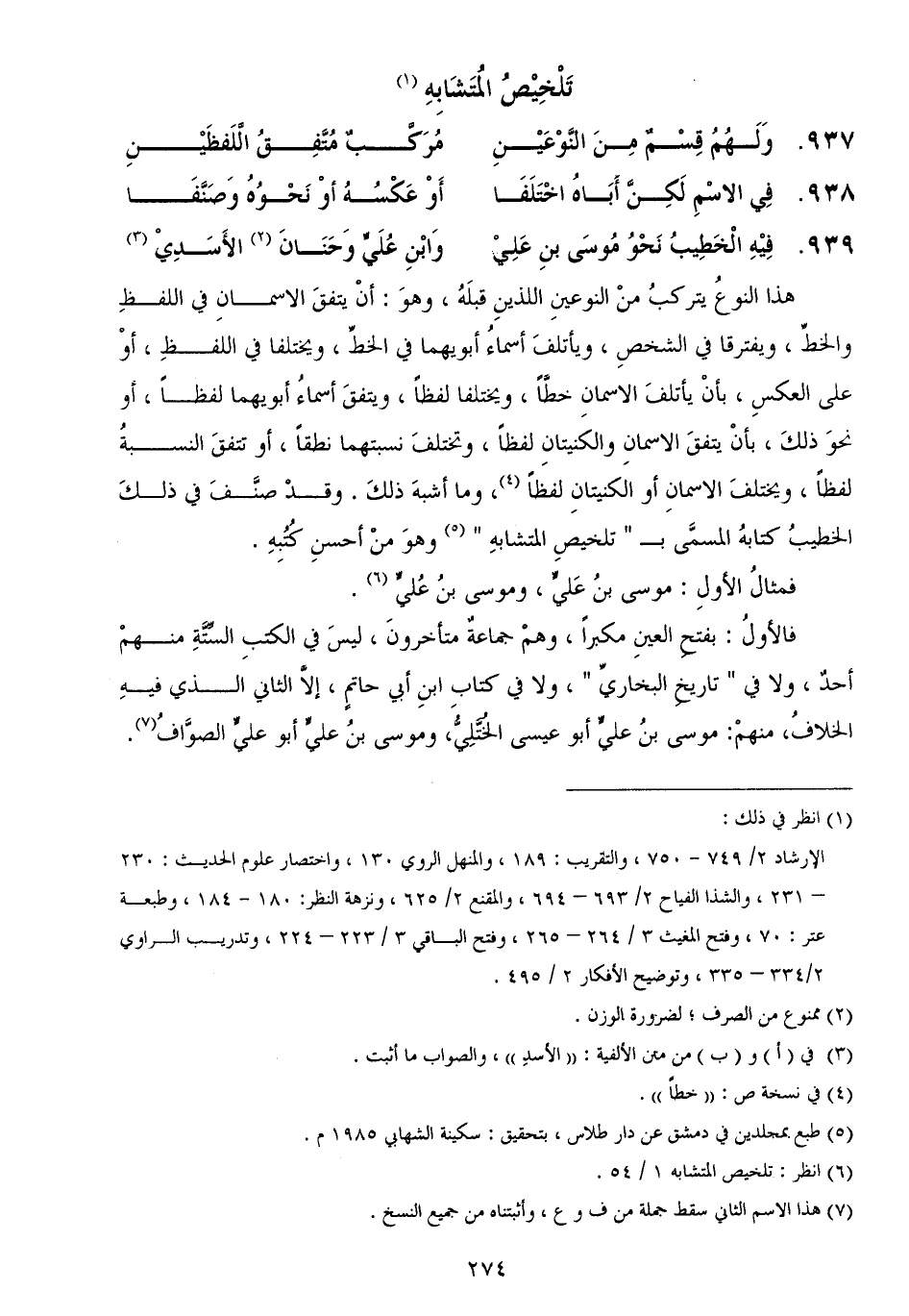 ... فِيْهِ الْخَطِيبُ نَحْوُ مُوسَى بنِ عَلِيْ ... وَابْنِ عُلَيٍّ وَحَنَانَ الأَسَدِيْ