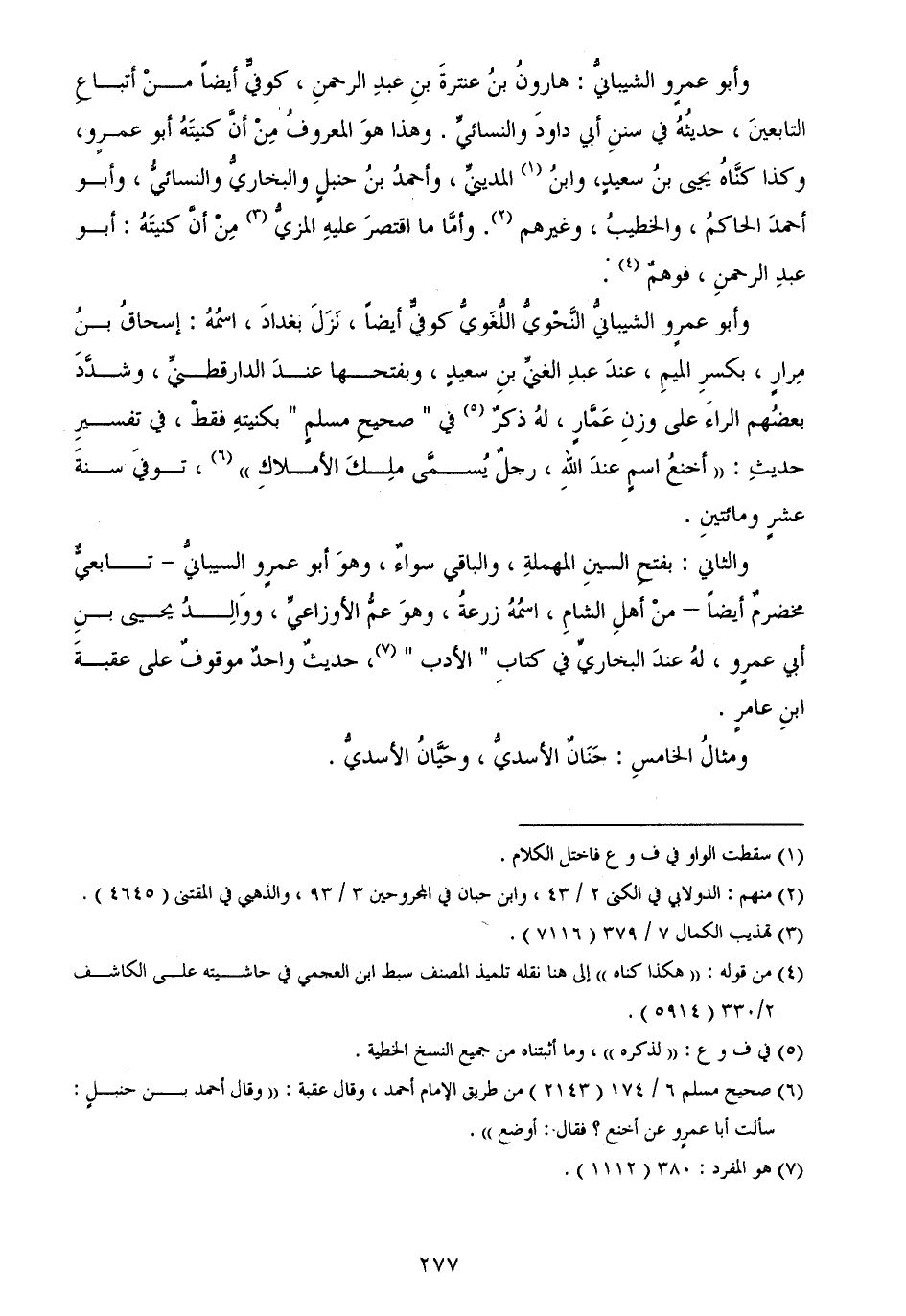 وأبو عمرٍو الشيبانيُّ النَّحْويُّ اللُّغَويُّ كوفيٌّ أيضاً، نَزَلَ بغدادَ، اسمُهُ: إسحاقُ بنُ مِرارٍ، بكسرِ الميمِ، عندَ عبدِ الغنيِّ بنِ سعيدٍ، وبفتحها عندَ الدارقطنيِّ، وشدَّدَ بعضُهم الراءَ على وزنِ عَمَّارٍ، لهُ ذكرٌ في " صحيحِ مسلمٍ " بكنيتهِ فقطْ، في تفسيرِ حديثِ: ((أخنعُ اسمٍ عندَ اللهِ، رجلٌ يُسمَّى ملِكَ الأملاكِ)) ، توفيَ سنةَ عشرٍ ومائتينِ.