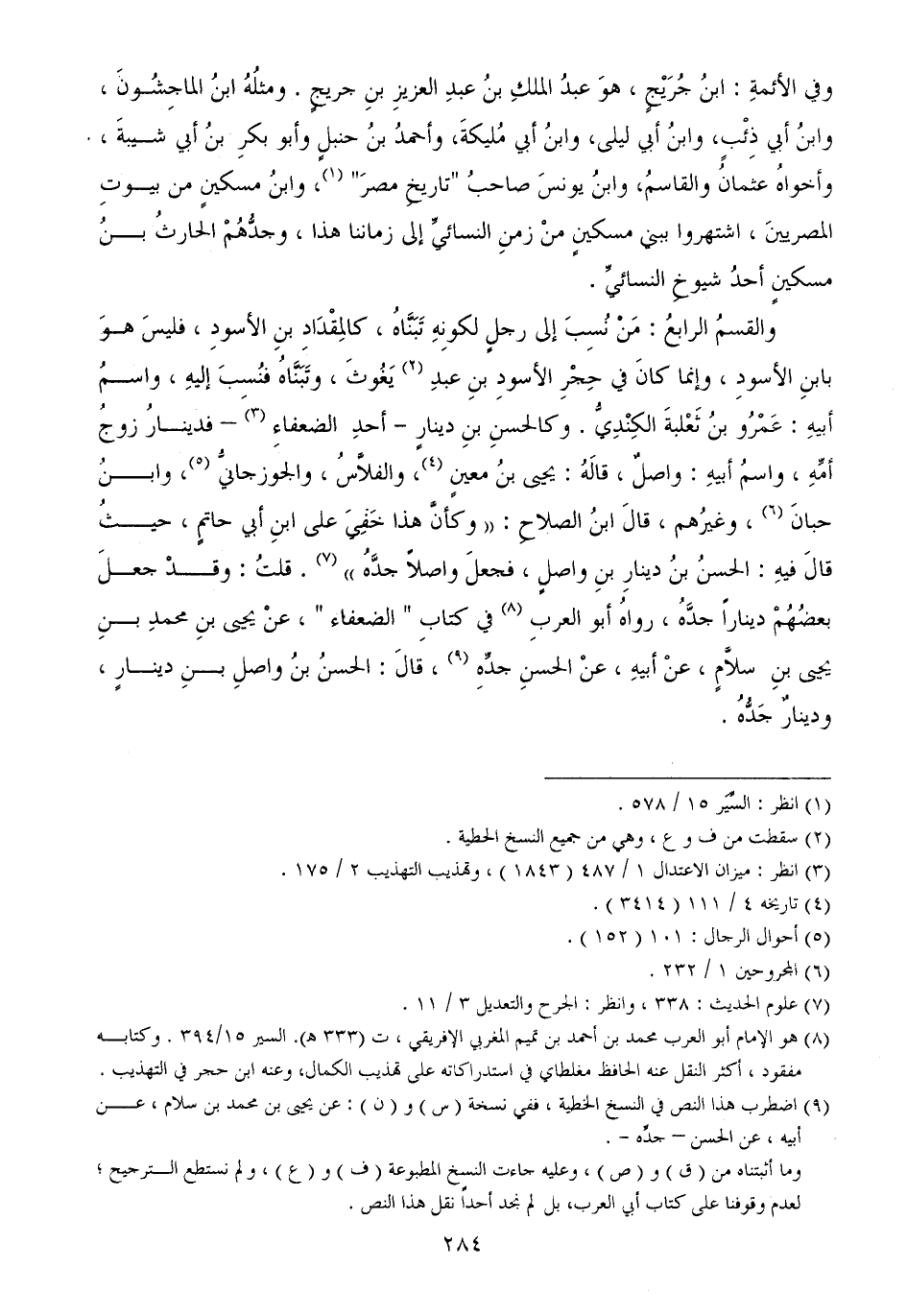 وفي الأئمةِ ابنُ جُرَيْجٍ، هوَ عبدُ الملكِ بنُ عبدِ العزيزِ بنِ جريجٍ ومثلُهُ ابنُ الماجِشُونَ، وابنُ أبي ذِئْبٍ، وابنُ أبي ليلى، وابنُ أبي مُليكةَ، وأحمدُ بنُ حنبلٍ وأبو بكرِ ابنُ أبي شيبةَ، وأخواهُ عثمانُ والقاسمُ، وابنُ يونسَ صاحبُ تاريخِ مصرَ، وابنُ مسكينٍ من بيوتِ المصريينَ، اشتهروا ببني مسكينٍ منْ زمنِ النسائيِّ إلى زماننا هذا، وجدُّهُمْ الحارثُ بنُ مسكينٍ أحدُ شيوخِ النسائيِّ