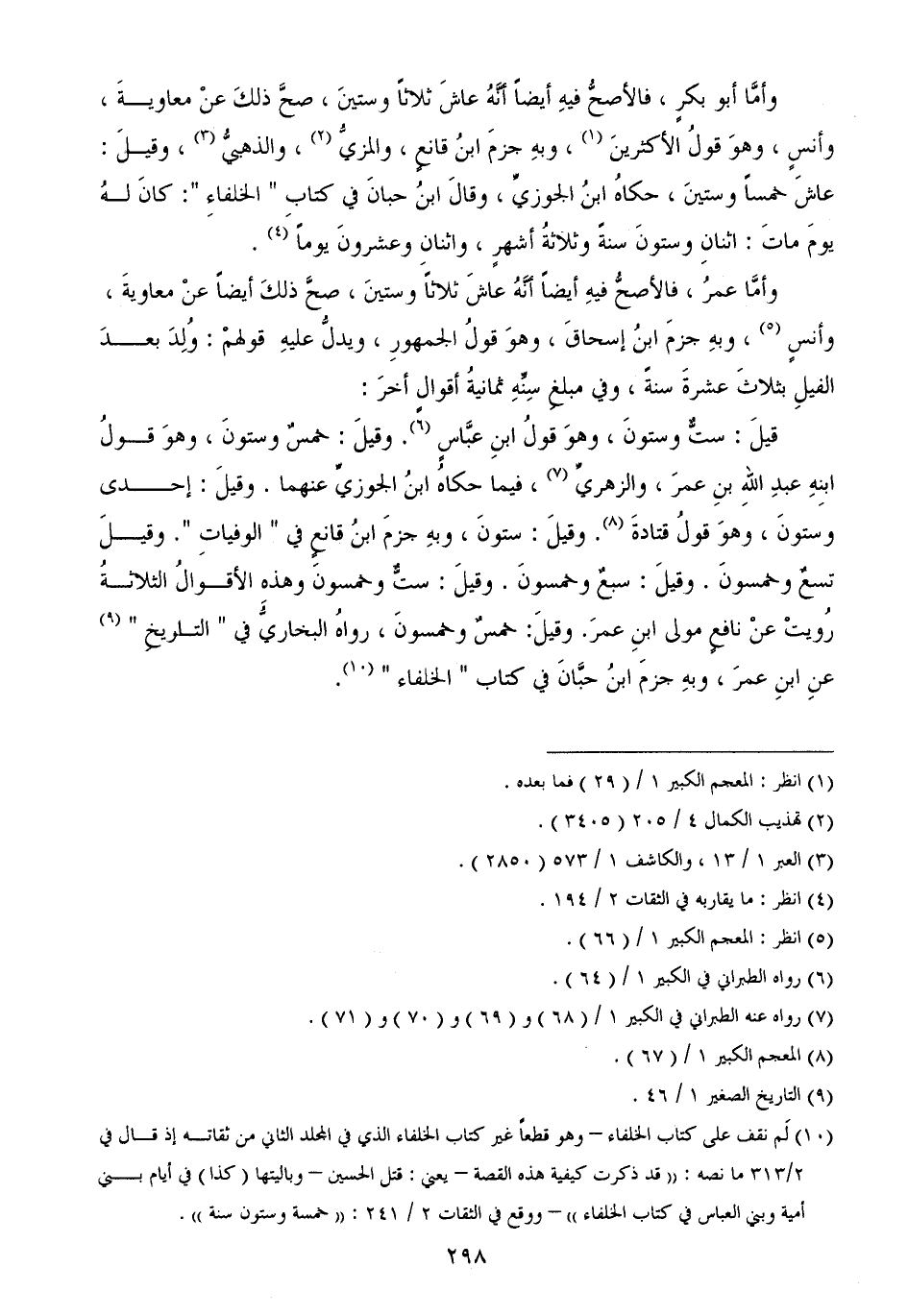 وأمَّا عمرُ، فالأصحُّ فيهِ أيضاً أنَّهُ عاشَ ثلاثاً وستينَ، صحَّ ذلكَ أيضاً عنْ معاويةَ، وأنسٍ، وبهِ جزمَ ابنُ إسحاقَ، وهوَ قولُ الجمهورِ، ويدلُّ عليهِ قولهمْ: وُلِدَ بعدَ الفيلِ بثلاثَ عشرةَ سنةً، وفي مبلغِ سِنِّهِ ثمانيةُ أقوالٍ أخرَ: