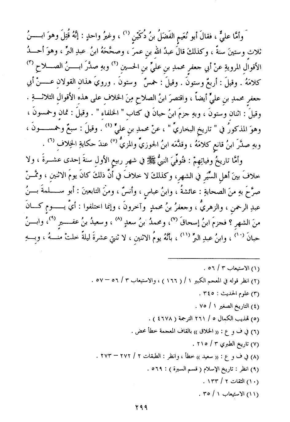 وأمَّا تاريخُ وفياتِهِمْ فتُوفِّيَ النبيُّ - صَلَّى اللهُ عَلَيْهِ وَسَلَّمَ - في شهرِ ربيعٍ الأولِ سنةَ إحدى عشرةَ، ولا خلافَ بينَ أهلِ السِّيَرِ في الشهرِ، وكذلكَ لا خلافَ في أنَّ ذلكَ كانَ يومَ الاثنينِ، وممَّنْ صرَّحَ بهِ منَ الصحابةِ عائشةُ، وابنُ عباسٍ، وأنسٌ، ومنَ التابعينَ أبو سلمةَ بنُ عبدِ الرحمنِ، والزهريُّ، وجعفرُ بنُ محمدٍ وآخرونَ، وإنما اختلفوا أيَّ يومٍ كانَ منَ الشهرِ؟ فجزمَ ابنُ إسحاقَ، ومحمدُ ابنُ سعدٍ، وسعيدُ بنُ عفيرٍ، وابنُ