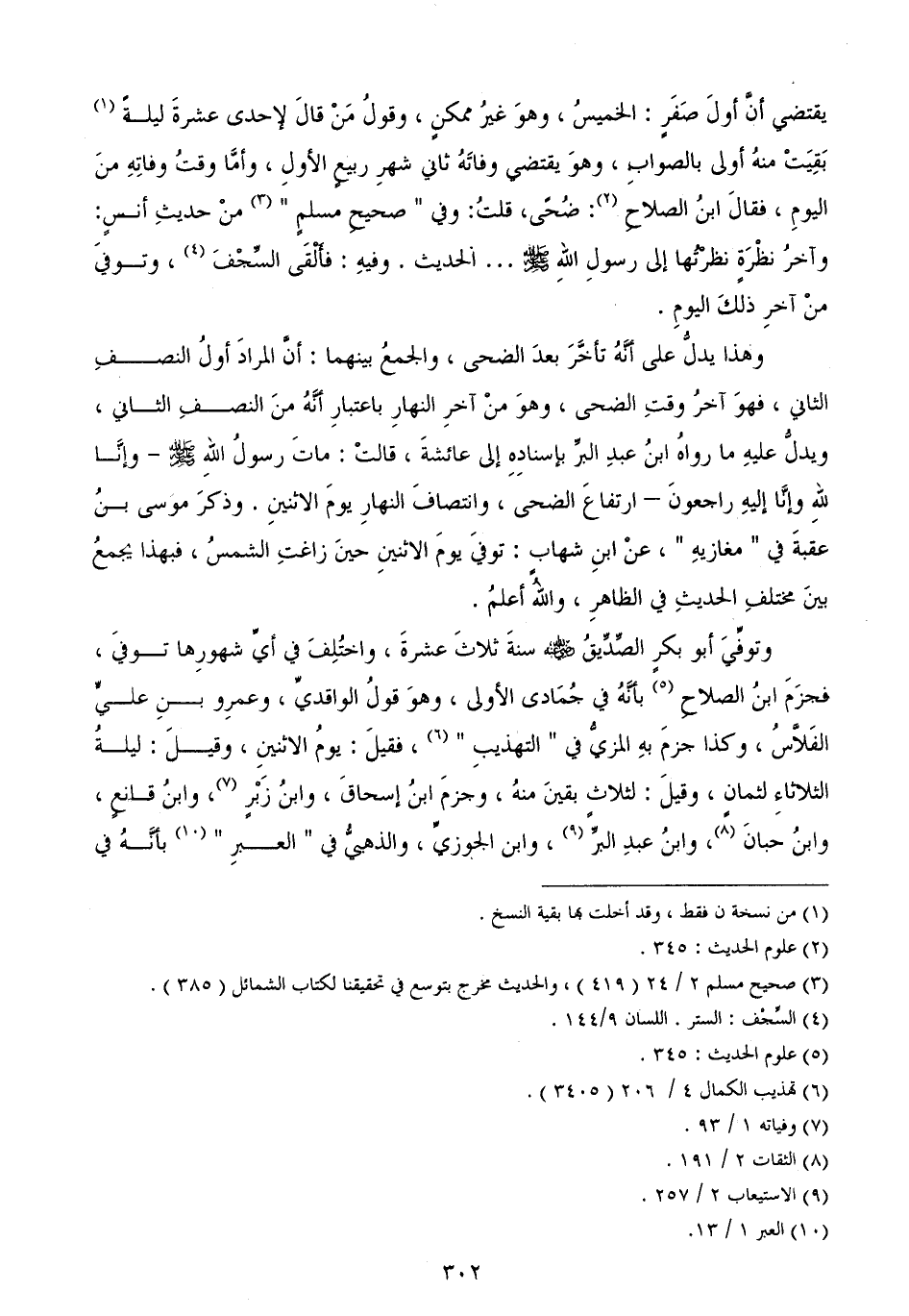 يقتضي أنَّ أولَ صَفَرٍ الخميسُ، وهوَ غيرُ ممكنٍ، وقولُ مَنْ قالَ لإحدى عشرةَ ليلةً بَقِيَتْ منهُ أولى بالصوابِ، وهوَ يقتضي وفاتَهُ ثاني شهرِ ربيعٍ الأولِ، وأمَّا وقتُ وفاتِهِ منَ اليومِ، فقالَ ابنُ الصلاحِ ضُحًى، قلتُ وفي صحيحِ مسلمٍ منْ حديثِ أنسٍ وآخرُ نظْرَةٍ نظرْتُها إلى رسولِ اللهِ - صَلَّى اللهُ عَلَيْهِ وَسَلَّمَ - ... الحديث وفيهِ فأَلْقَى السِّجْفَ، وتوفيَ منْ آخرِ ذلكَ اليومِ
