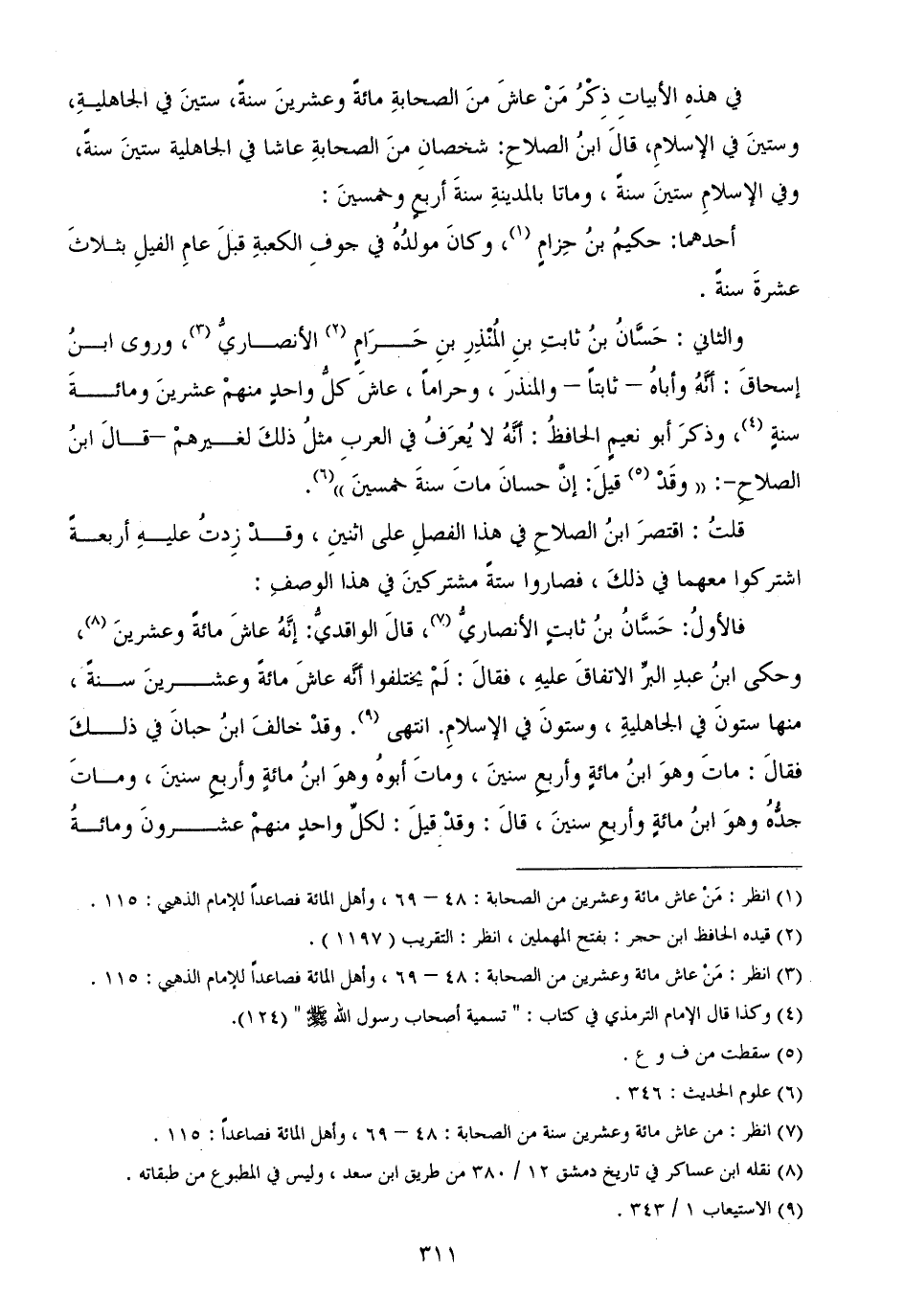 في هذهِ الأبياتِ ذِكْرُ مَنْ عاشَ منَ الصحابةِ مائةً وعشرينَ سنةً، ستينَ في الجاهليةِ، وستينَ في الإسلامِ، قالَ ابنُ الصلاحِ شخصانِ منَ الصحابةِ عاشا في الجاهلية ستينَ سنةً، وفي الإسلامِ ستينَ سنةً، وماتا بالمدينةِ سنةَ أربعٍ وخمسينَ