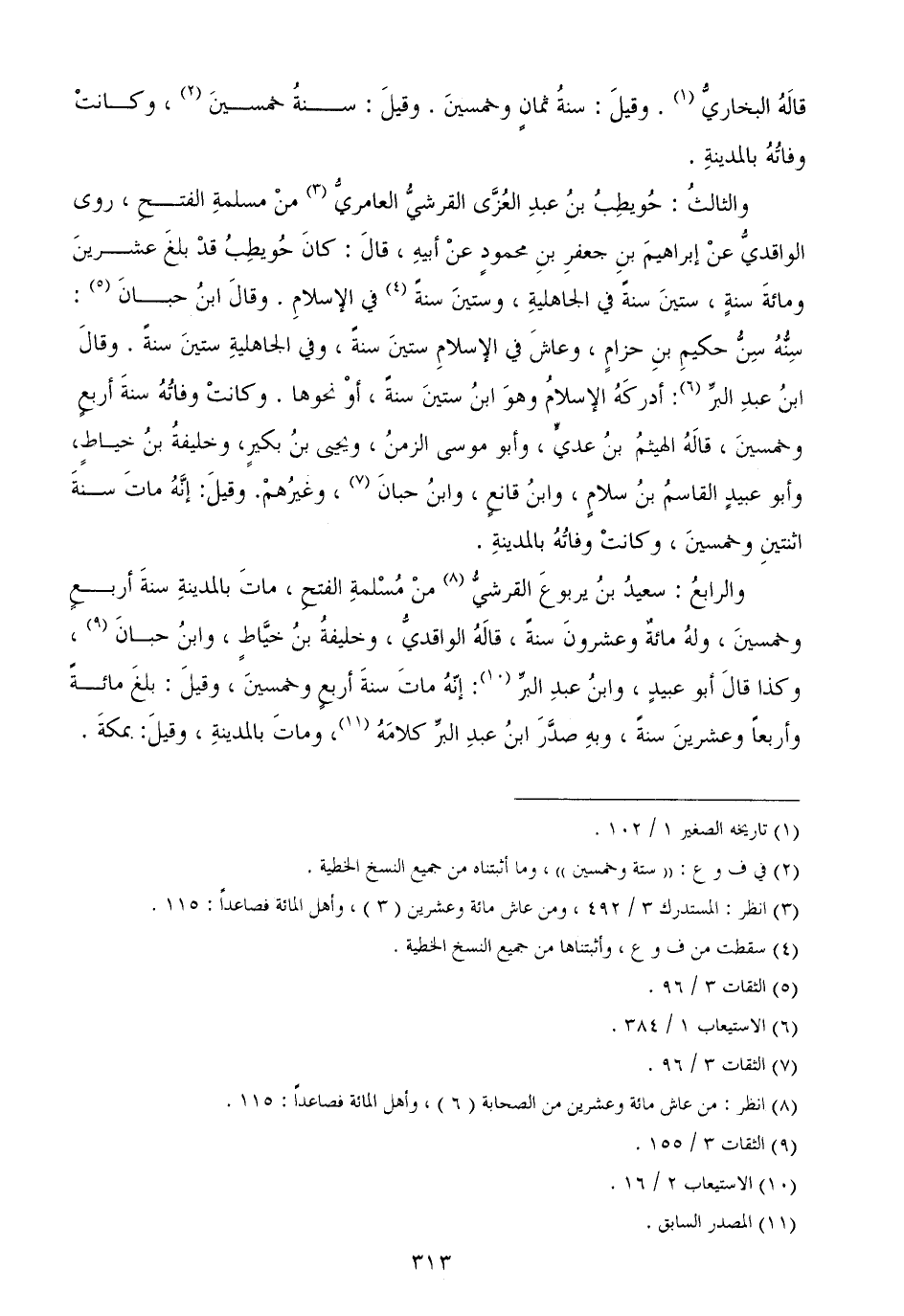 والثالثُ حُويطِبُ بنُ عبدِ العُزَّى القرشيُّ العامريُّ منْ مسلمةِ الفتحِ، روى الواقديُّ عنْ إبراهيمَ بنِ جعفرِ بنِ محمودٍ عنْ أبيهِ، قالَ كانَ حُويطِبُ قدْ بلغَ عشرينَ ومائةَ سنةٍ، ستينَ سنةً في الجاهليةِ، وستينَ سنةً في الإسلامِ وقالَ ابنُ حبانَ سِنُّهُ سِنُّ حكيمِ بنِ حزامٍ، وعاشَ في الإسلامِ ستينَ سنةً، وفي الجاهليةِ ستينَ سنةً وقالَ ابنُ عبدِ البرِّ أدركَهُ الإسلامُ وهوَ ابنُ ستينَ سنةً، أوْ نحوها وكانتْ وفاتُهُ سنةَ أربعٍ وخمسينَ، قالَهُ الهيثمُ ابنُ عديٍّ، وأبو موسى الزمنُ، ويحيى بنُ بكيرٍ، وخليفةُ بنُ خياطٍ، وأبو عبيدٍ القاسمُ بنُ سلامٍ، وابنُ قانعٍ، وابنُ حبانَ، وغيرُهمْ وقيلَ إنَّهُ ماتَ سنةَ اثنتينِ وخمسينَ، وكانتْ وفاتُهُ بالمدينةِ