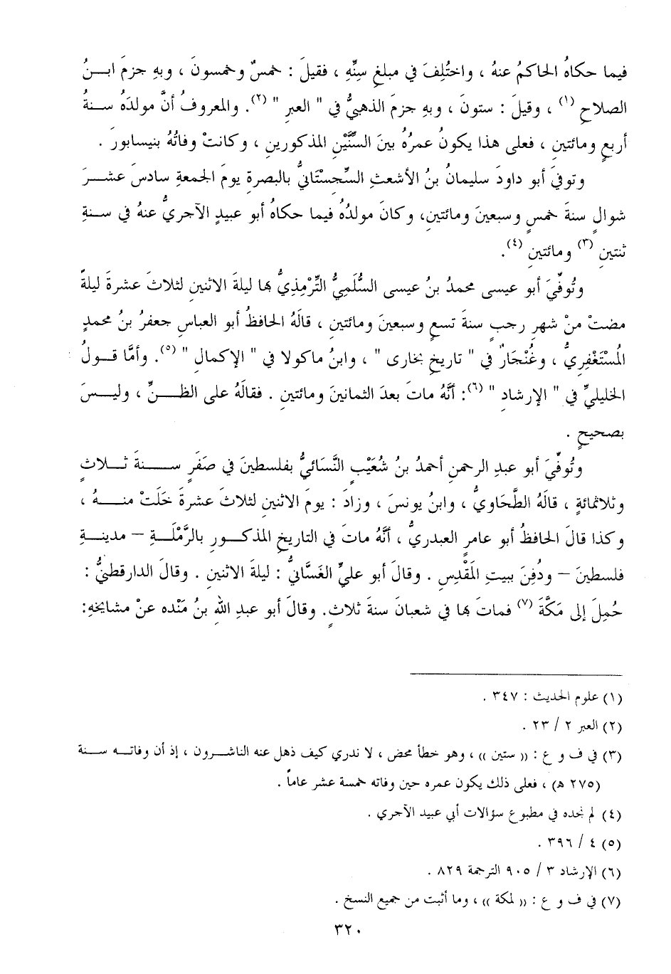 وتوفيَ أبو داودَ سليمانُ بنُ الأشعثِ السِّجِسْتَانيُّ بالبصرةِ يومَ الجمعةِ سادسَ عشرَ شوالٍ سنةَ خمسٍ وسبعينَ ومائتينِ، وكانَ مولدُهُ فيما حكاهُ أبو عبيدٍ الآجريُّ عنهُ في سنةِ ثنتينِ ومائتينِ