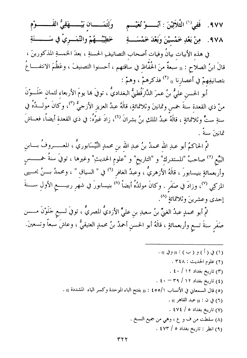 ثمَّ الحاكمُ أبو عبدِ اللهِ محمدُ بنُ عبدِ اللهِ بنِ محمدٍ النَّيْسَابوريُّ، المعروفُ بابنِ البَيِّعِ صاحبُ المستدركِ والتاريخِ وعلومِ الحديثِ وغيرها، توفيَ سنةُ خمسٍ وأربعمائةٍ بنيسابورَ، قالَهُ الأزهريُّ، وعبدُ الغافرِ في السياقِ، ومحمدُ بنُ يحيى المزكِي، وزادَ في صَفَرٍ وكانَ مولدُهُ أيضاً بنيسابورَ في شهرِ ربيعٍ الأولِ سنةَ إحدى وعشرينَ وثلاثمائةٍ