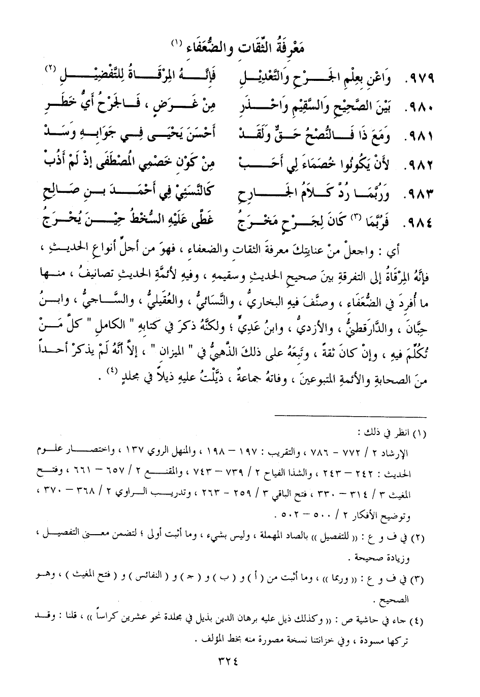 أي واجعلْ منْ عنايتِكَ معرفةَ الثقاتِ والضعفاءِ، فهوَ من أجلِّ أنواعِ الحديثِ، فإنَّهُ المِرْقَاةُ إلى التفرقةِ بينَ صحيحِ الحديثِ وسقيمهِ، وفيهِ لأئمَّةِ الحديثِ تصانيفُ، منها ما أُفرِدَ في الضُّعَفَاءِ، وصنَّفَ فيهِ البخاريُّ، والنَّسَائيُّ، والعُقَيليُّ، والسَّاجيُّ، وابنُ حِبَّانَ، والدَّارَقطنيُّ، والأزديُّ، وابنُ عَدِيٍّ؛ ولكنَّهُ ذكرَ في كتابِهِ الكاملِ كلَّ مَنْ تُكُلِّمَ فيهِ، وإنْ كانَ ثقةً، وتَبِعَهُ على ذلكَ الذَّهبيُّ في الميزانِ، إلاَّ أنَّهُ لَمْ يذكرْ أحداً منَ الصحابةِ والأئمةِ المتبوعينَ، وفاتهُ جماعةٌ، ذيَّلْتُ عليهِ ذيلاً في مجلدٍ
