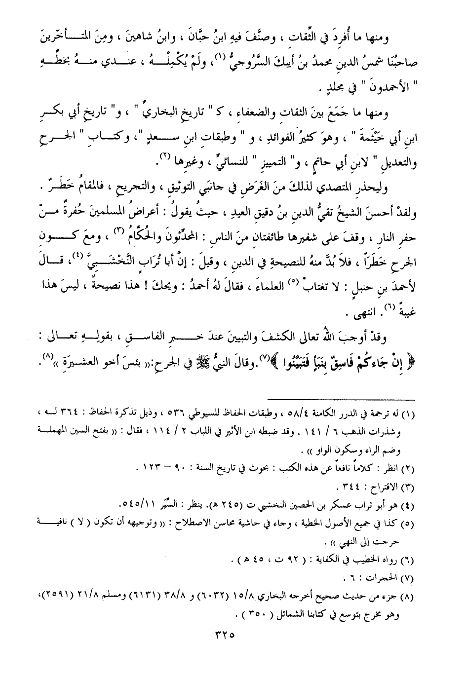 وليحذرِ المتصدي لذلكَ منَ الغَرَضِ في جانبَي التوثيقِ، والتجريحِ، فالمقامُ خَطَرٌ ولقدْ أحسنَ الشيخُ تقيُّ الدينِ بنُ دقيقِ العيدِ، حيثُ يقولُ أعراضُ المسلمينَ حُفرةٌ منْ حفرِ النارِ، وقفَ على شفيرها طائفتانِ منَ الناسِ المحدِّثونَ والحُكَّامُ، ومعَ كونِ الجرحِ خَطَرَاً، فلاَ بُدَّ منهُ للنصيحةِ في الدينِ، وقيلَ إنَّ أبا تُرَابٍ النَّخْشَبِيَّ، قالَ لأحمدَ بنِ حنبلٍ لا تغتابْ العلماءَ، فقالَ لهُ أحمدُ ويحكَ هذا نصيحةٌ، ليسَ هذا غيبةً انتهى