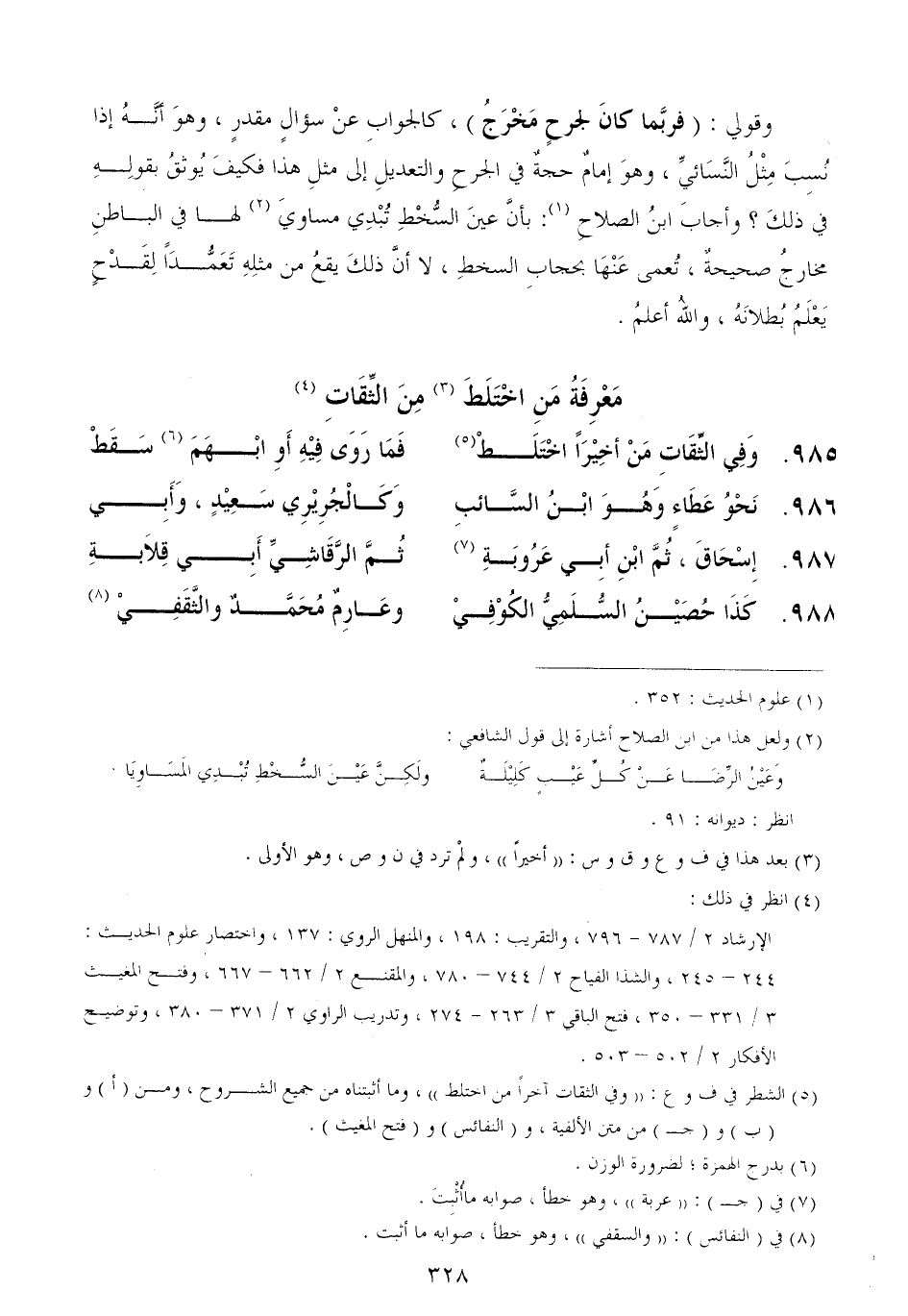 وقولي فربَّما كانَ لجرحٍ مَخْرَجُ، كالجوابِ عنْ سؤالٍ مقدرٍ، وهوَ أنَّهُ إذا نُسِبَ مِثْلُ النَّسَائيِّ، وهوَ إمامٌ حجةٌ في الجرحِ والتعديلِ إلى مثلِ هذا فكيفَ يُوثقُ بقولِهِ في ذلكَ؟ وأجابَ ابنُ الصلاحِ بأنَّ عينَ السُّخْطِ تُبْدِي مساويَ لها في الباطنِ مخارجُ صحيحةٌ، تُعمى عَنْهَا بحجابِ السخطِ، لا أنَّ ذلكَ يقعُ من مثلِهِ تَعَمُّدَاً لِقَدْحٍ يَعْلَمُ بُطلانَهُ، واللهُ أعلمُ