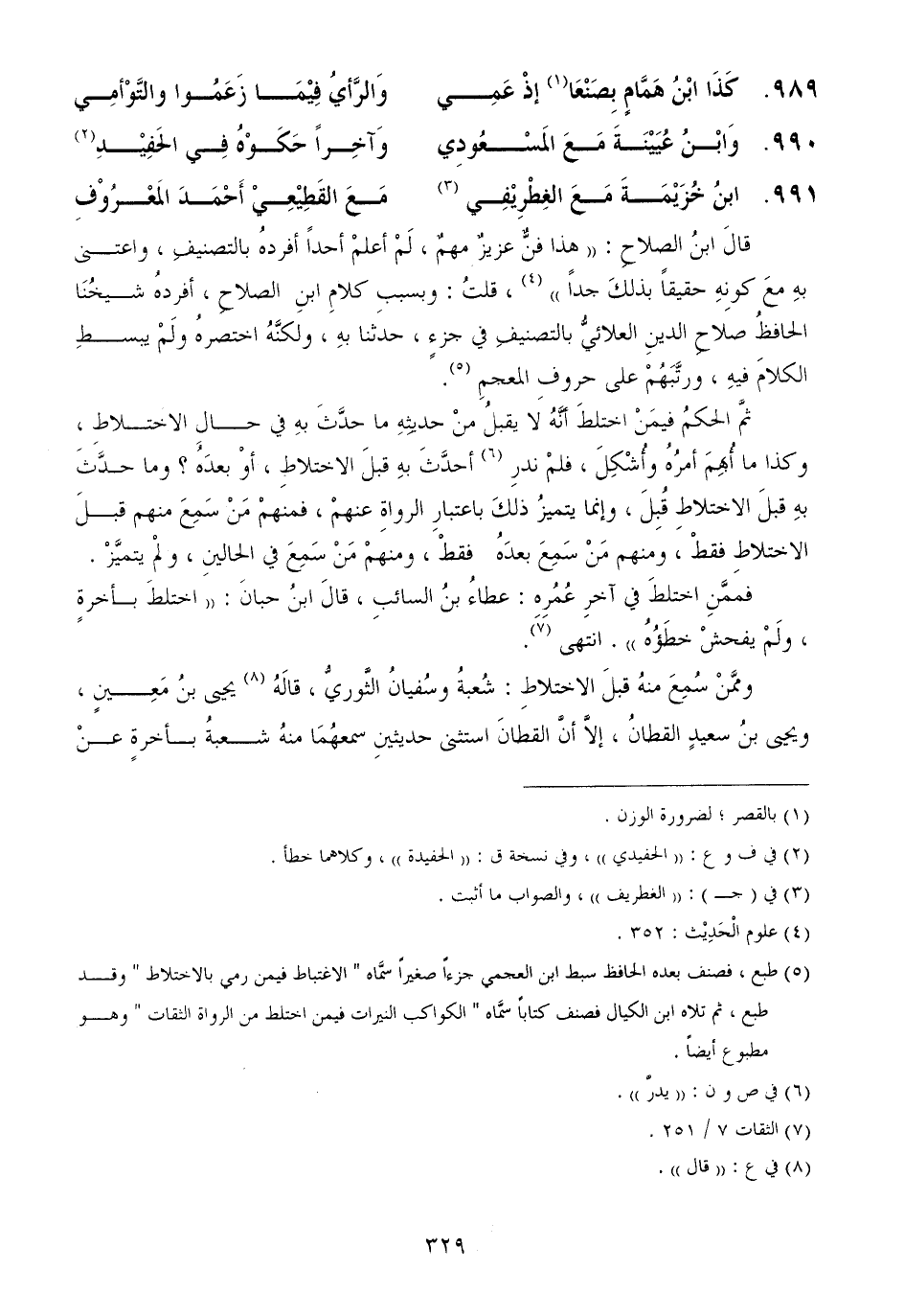 قالَ ابنُ الصلاحِ: ((هذا فنٌّ عزيزٌ مهمٌ، لَمْ أعلمْ أحداً أفردهُ بالتصنيفِ، واعتنى بهِ معَ كونِهِ حقيقاً بذلكَ جداً)) ، قلتُ: وبسببِ كلامِ ابنِ الصلاحِ، أفردهُ شيخُنَا الحافظُ صلاحِ الدينِ العلائيُّ بالتصنيفِ في جزءٍ، حدثنا بهِ، ولكنَّهُ اختصرهُ ولَمْ يبسطِ الكلامَ فيهِ، ورتَّبَهُمْ على حروفِ المعجمِ.