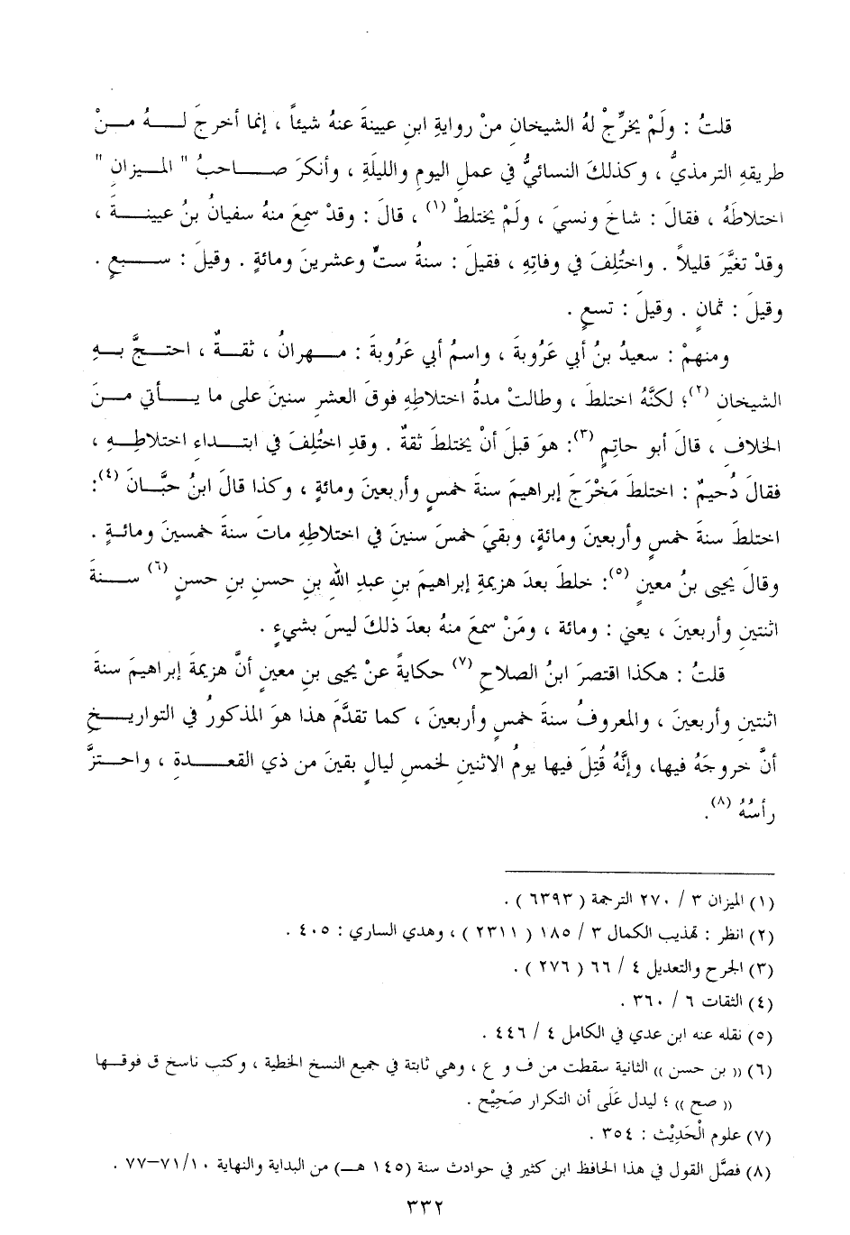ومنهمْ: سعيدُ بنُ أبي عَرُوبةَ، واسمُ أبي عَرُوبةَ: مهرانُ، ثقةٌ، احتجَّ بهِ الشيخانِ؛ لكنَّهُ اختلطَ، وطالتْ مدةُ اختلاطِهِ فوقَ العشرِ سنينَ على ما يأتي منَ الخلافِ، قالَ أبو حاتِمٍ: هوَ قبلَ أنْ يختلطَ ثقةٌ. وقدِ اختُلِفَ في ابتداءِ اختلاطِهِ، فقالَ دُحيمٌ: اختلطَ مَخْرَجَ إبراهيمَ سنةَ خمسٍ وأربعينَ ومائةٍ، وكذا قالَ ابنُ حبَّانَ: اختلطَ سنةَ خمسٍ وأربعينَ ومائةٍ، وبقيَ خمسَ سنينَ في اختلاطِهِ ماتَ سنةَ خمسينَ ومائةٍ. وقالَ يحيى بنُ معينٍ: خلطَ بعدَ هزيمةِ إبراهيمَ بنِ عبدِ اللهِ بنِ حسنِ بنِ حسنٍ سنةَ اثنتينِ وأربعينَ، يعني: ومائة، ومَنْ سمعَ منهُ بعدَ ذلكَ ليسَ بشيءٍ.