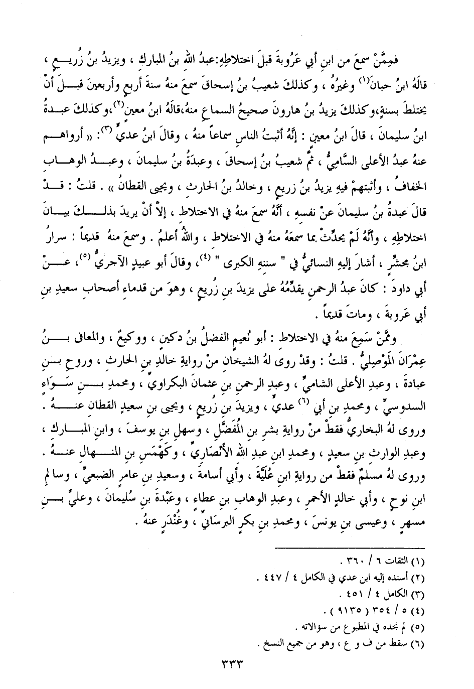 فمِمَّنْ سمعَ من ابنِ أبي عَرُوبةَ قبلَ اختلاطِهِ: عبدُ اللهِ بنُ المباركِ، ويزيدُ بنُ زُريعٍ، قالَهُ ابنُ حبانَ وغيرُهُ، وكذلكَ شعيبُ بنُ إسحاقَ سمعَ منهُ سنةَ أربعٍ وأربعينَ قبلَ أنْ يختلطَ بسنةٍ، وكذلكَ يزيدُ بنُ هارونَ صحيحُ السماعِ منهُ، قالَهُ ابنُ معينٍ، وكذلكَ عبدةُ ابنُ سليمانَ، قالَ ابنُ معينٍ: إنَّهُ أثبتُ الناسِ سماعاً منهُ، وقالَ ابنُ عديٍّ: ((أرواهم عنهُ عبدُ الأعلى السَّامِيُّ، ثمَّ شعيبُ بنُ إسحاقَ، وعبدَةُ بنُ سليمانَ، وعبدُ الوهابِ الخفافُ، وأثبتهمْ فيهِ يزيدُ بنُ زريعٍ، وخالدُ بنُ الحارثِ، ويحيى القطانُ)) . قلتُ: قدْ قالَ عبدةُ بنُ سليمانَ عنْ نفسِهِ، أنَّهُ سمعَ منهُ في الاختلاطِ، إلاَّ أنْ يريدَ بذلكَ بيانَ اختلاطِهِ، وأنَّهُ لَمْ يحدِّثْ بما سمعَهُ منهُ في الاختلاطِ، واللهُ أعلمُ. وسمعَ منهُ قديماً: سرارُ ابنُ مجشِّرٍ، أشارَ إليهِ النسائيُّ في " سننِهِ الكبرى "، وقالَ أبو عبيدٍ الآجريُّ، عنْ أبي داودَ: كانَ عبدُ الرحمنِ يقدِّمُهُ على يزيدَ بنِ زُريعٍ، وهوَ من قدماءِ أصحابِ سعيدِ بنِ أبي عَروبةَ، وماتَ قديماً.