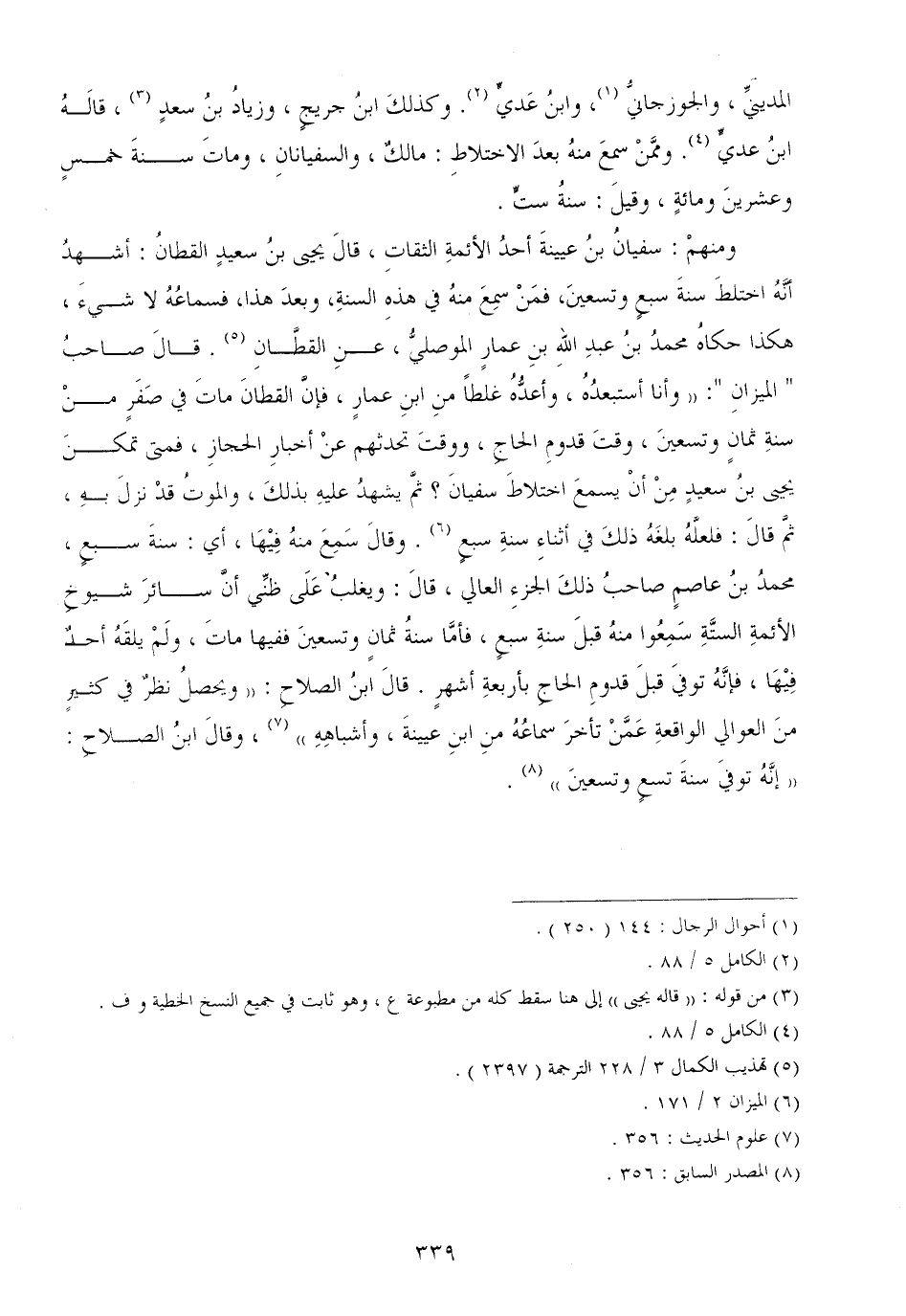ومنهمْ: سفيانُ بنُ عيينةَ أحدُ الأئمةِ الثقاتِ، قالَ يحيى بنُ سعيدٍ القطانُ: أشهدُ أنَّهُ اختلطَ سنةَ سبعٍ وتسعينَ، فمَنْ سمِعَ منهُ في هذهِ السنةِ، وبعدَ هذا، فسماعُهُ لا شيءَ، هكذا حكاهُ محمدُ بنُ عبدِ اللهِ بنِ عمارٍ الموصليُّ، عنِ القطَّانِ. قالَ صاحبُ " الميزانِ ": ((وأنا أستبعدُهُ، وأعدُّهُ غلطاً منِ ابنِ عمارٍ، فإنَّ القطانَ ماتَ في صَفَرٍ منْ سنةِ ثمانٍ وتسعينَ، وقتَ قدومِ الحاجِ، ووقتَ تحدثهم عنْ أخبارِ الحجازِ، فمتى تمكنَ يحيى بنُ سعيدٍ مِنْ أنْ يسمعَ اختلاطَ سفيانَ؟ ثمَّ يشهدُ عليهِ بذلكَ، والموتُ قدْ نزلَ بهِ، ثمَّ قالَ: فلعلَّهُ بلغَهُ ذلكَ في أثناءِ سنةِ سبعٍ. وقالَ سَمِعَ منهُ فِيْهَا، أي: سنةَ سبعٍ، محمدُ بنُ عاصمٍ صاحبُ ذلكَ الجزءِ العالي، قالَ: ويغلبُ عَلَى ظنِّي أنَّ سائرَ شيوخِ الأئمةِ الستَّةِ سَمِعُوا منهُ قبلَ سنةِ سبعٍ، فأمَّا سنةُ ثمانٍ وتسعينَ ففيها ماتَ، ولَمْ يلقَهُ أحدٌ فِيْهَا، فإنَّهُ توفيَ قبلَ قدومِ الحاجِ بأربعةِ أشهرٍ. قالَ ابنُ الصلاحِ: ((ويحصلُ نظرٌ في كثيرٍ منَ العوالي الواقعةِ عَمَّنْ تأخرَ سماعُهُ منِ ابنِ عيينةَ، وأشباهِهِ)) ، وقالَ ابنُ الصلاحِ: ((إنَّهُ توفيَ سنةَ تسعٍ وتسعينَ)) .