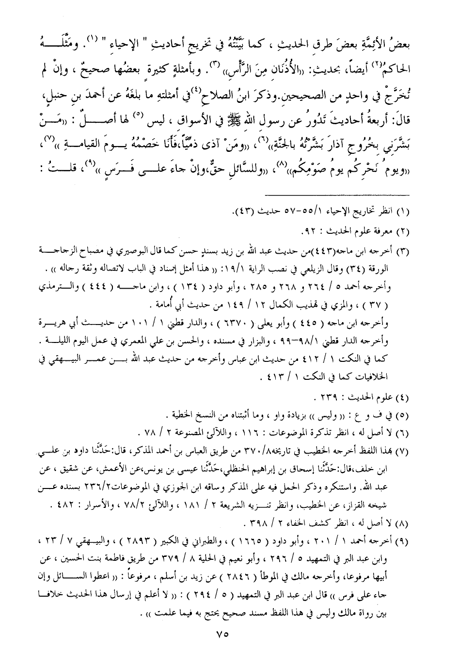 بعضُ الأئِمَّةِ بعضَ طرقِ الحديثِ، كما بَيَّنْتُهُ في تخريجِ أحاديثِ " الإحياءِ ". ومَثَّلَهُ الحاكمُ أيضاً، بحديثِ: ((الأُذُنَانِ مِنَ الرَّأْسِ)) . وبأمثلةٍ كثيرةٍ بعضُها صحيحٌ، وإنْ لم تُخَرَّجْ في واحدٍ من الصحيحينِ.