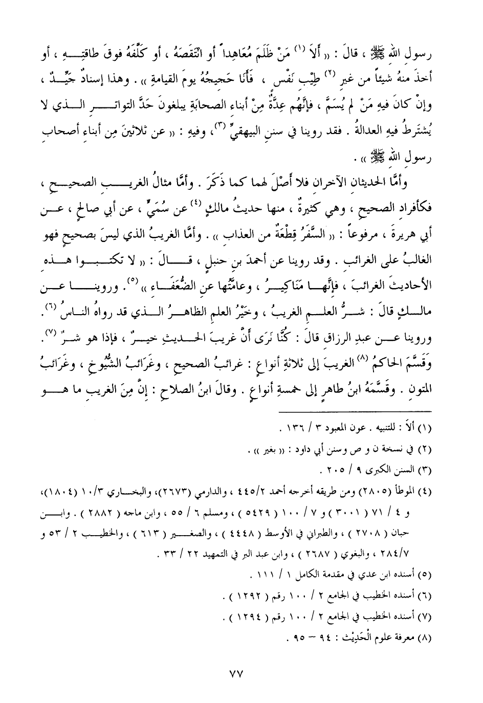 رسولِ اللهِ - صَلَّى اللهُ عَلَيْهِ وَسَلَّمَ -، قالَ: ((أَلاَ مَنْ ظَلَمَ مُعَاهِداً أو انْتَقَصَهُ، أو كَلَّفَهُ فوقَ طاقتِهِ، أو أخذَ منهُ شيئاً من غيرِ طِيْبِ نَفْسٍ، فَأَنَا حَجِيجُهُ يومَ القيامةِ)) . وهذا إسنادٌ جَيِّدٌ، وإنْ كانَ فيهِ مَنْ لم يُسَمَّ، فإنَّهُم عِدَّةٌ مِنْ أبناءِ الصحابَةِ يبلغونَ حَدَّ التواترِ الذي لا يُشتَرطُ فيهِ العدالةُ. فقد روينا في سننِ البيهقيِّ، وفيهِ: ((عن ثلاثينَ مِن أبناءِ أصحابِ رسولِ اللهِ - صَلَّى اللهُ عَلَيْهِ وَسَلَّمَ -)) .