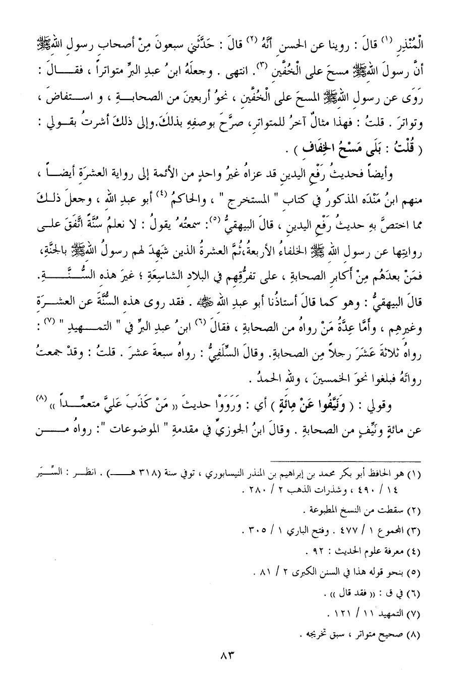 الْمُنْذِرِ قالَ: روينا عن الحسنِ أنَّهُ قالَ: حَدَّثَني سبعونَ مِنْ أصحابِ رسولِ اللهِ - صَلَّى اللهُ عَلَيْهِ وَسَلَّمَ - أنَّ رسولَ اللهِ - صَلَّى اللهُ عَلَيْهِ وَسَلَّمَ - مسحَ لى الْخُفَّينِ. انتهى. وجعلَهُ ابنُ عبدِ البرِّ متواتراً، فقالَ: رَوَى عن رسولِ اللهِ - صَلَّى اللهُ عَلَيْهِ وَسَلَّمَ - المسحَ على الْخُفَّينِ، نحوُ أربعينَ من الصحابةِ، واستفاضَ، وتواترَ. قلتُ: فهذا مثالٌ آخرُ للمتواترِ، صرَّحَ بوصفِهِ بذلكَ. وإلى ذلكَ أشرتُ بقولي: (قُلْتُ: بَلَى مَسْحُ الخِفَافِ) .