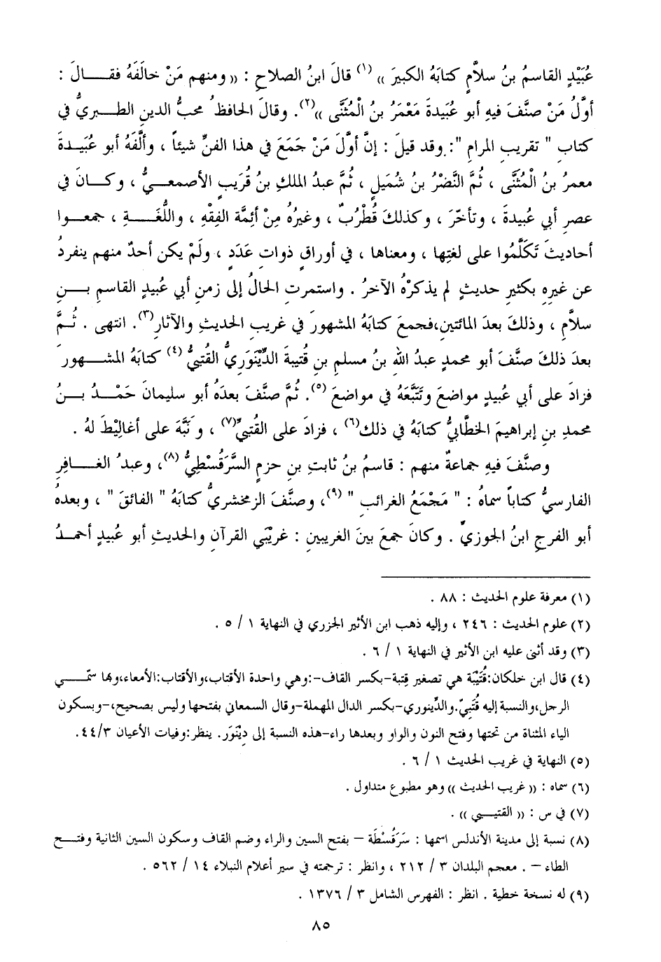 عُبَيْدٍ القاسمُ بنُ سلاَّمٍ كتابَهُ الكبيرَ)) قالَ ابنُ الصلاحِ: ((ومنهم مَنْ خالَفَهُ فقالَ: أوَّلُ مَنْ صنَّفَ فيهِ أبو عُبَيدةَ مَعْمَرُ بنُ الْمُثَنَّى)) . وقالَ الحافظُ محبُّ الدينِ الطبريُّ في كتابِ " تقريبِ المرامِ ": وقد قيلَ: إنَّ أوَّلَ مَنْ جَمَعَ في هذا الفنِّ شيئاً، وألَّفَهُ أبو عُبَيدةَ معمرُ بنُ الْمُثَنَّى، ثُمَّ النَّضْرُ بنُ شُمَيلٍ، ثُمَّ عبدُ الملكِ بنُ قُرَيبٍ الأصمعيُّ، وكانَ في عصرِ أبي عُبيدةَ، وتأخّرَ، وكذلكَ قُطْرُبٌ، وغيرُهُ مِنْ أئِمَّة الفِقْهِ، واللُّغَةِ، جمعوا أحاديثَ تَكَلَّمُوا على لغتِها، ومعناها، في أوراقٍ ذواتِ عَدَدٍ، ولَمْ يكن أحدٌ منهم ينفردُ عن غيرِهِ بكثيرِ حديثٍ لم يذكرْهُ الآخرُ. واستمرتِ الحالُ إلى زمنِ أبي عُبيدٍ القاسمِ بنِ سلاَّمِ، وذلكَ بعدَ المائتينِ، فجمعَ كتابَهُ المشهورَ في غريبِ الحديثِ والآثارِ. انتهى. ثُمَّ بعدَ ذلكَ صنَّفَ أبو محمدٍ عبدُ اللهِ بنُ مسلمِ بنِ قُتيبةَ الدِّيْنَوَرِيُّ القُتبيُّ كتابَهُ المشهورَ فزادَ على أبي عُبيدٍ مواضعَ وتَتَبَّعَهُ في مواضعَ. ثُمَّ صنَّفَ بعدَهُ أبو سليمانَ حَمْدُ بنُ محمدِ بنِ إبراهيمَ الخطَّابيُّ كتابَهُ في ذلك، فزادَ على القُتبيِّ، وَنَبَّهَ على أغالِيْطَ لهُ.