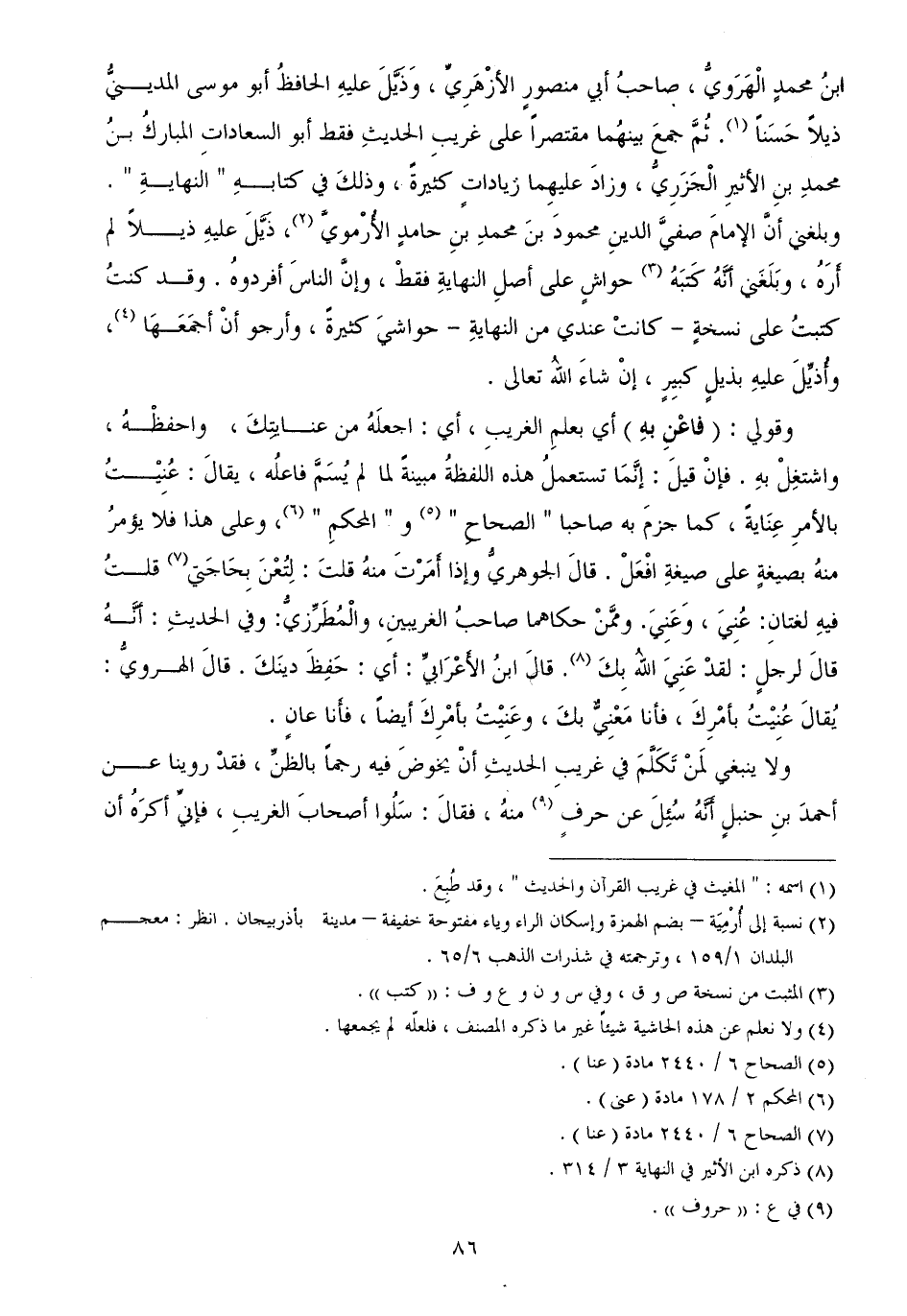 بنُ محمدٍ الْهَرَويُّ، صاحبُ أبي منصورٍ الأزْهَرِيِّ، وَذَيَّلَ عليهِ الحافظُ أبو موسى المدينيُّ ذيلاً حَسَناً. ثُمَّ جمعَ بينهُما مقتصراً على غريبِ الحديثِ فقط أبو السعاداتِ المباركُ بنُ محمدِ بنِ الأثيرِ الْجَزَرِيُّ، وزادَ عليهِما زياداتٍ كثيرةً، وذلكَ في كتابهِ " النهايةِ ". وبلغني أنَّ الإمامَ صفيَّ الدينِ محمودَ بنَ محمدِ بنِ حامدٍ الأُرْمويَّ، ذَيَّلَ عليهِ ذيلاً لم أَرَهُ، وبَلَغَني أنَّهُ كَتبَهُ حواشٍ على أصلِ النهايةِ فقطْ، وإنَّ الناسَ أفردوهُ. وقد كنتُ كتبتُ على نسخةٍ - كانتْ عندي من النهايةِ - حواشيَ كثيرةً، وأرجو أنْ أجمَعَهَا، وأُذيِّلَ عليهِ بذيلٍ كبيِرٍ، إنْ شاءَ اللهُ تعالى.