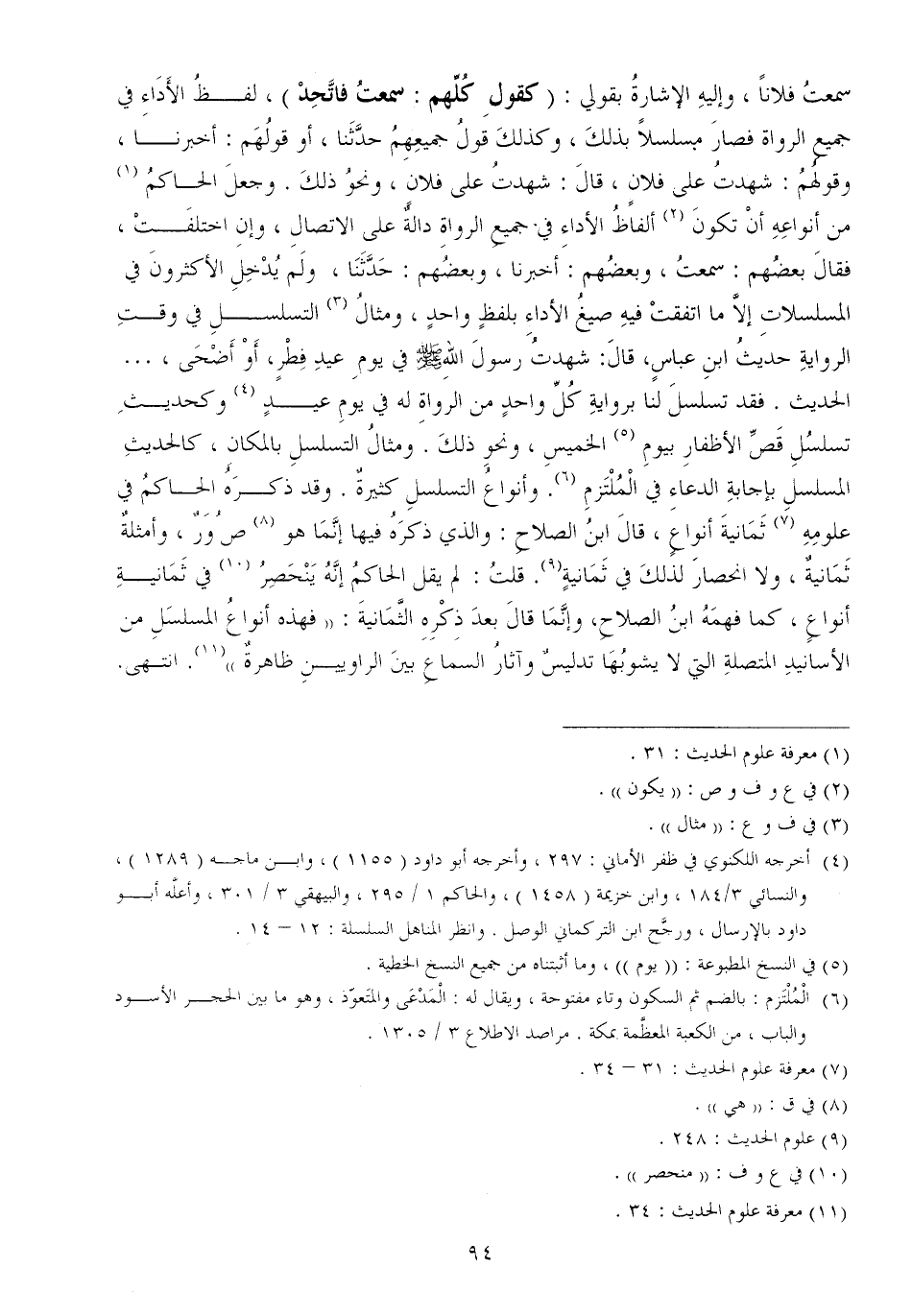 سمعتُ فلاناً، وإليهِ الإشارةُ بقولي: (كقولِ كُلِّهم: سمعتُ فاتَّحِدْ) ، لفظُ الأَدَاءِ في جميعِ الرواة فصارَ مسلسلاً بذلكَ، وكذلكَ قولُ جميعِهِمُ حدَّثَنا، أو قولُهَم: أخبرنا، وقولهُمُ: شهدتُ على فلانٍ، قالَ: شهدتُ على فلانٍ، ونحوُ ذلكَ. وجعلَ الحاكمُ من أنواعِهِ أنْ تكونَ ألفاظُ الأداءِ في جميعِ الرواةِ دالةٌ على الاتصالِ، وإنِ اختلفَتْ، فقالَ بعضُهم: سمعتُ، وبعضُهم: أخبرنا، وبعضُهم: حَدَّثَنَا، ولَم يُدْخِلِ الأكثرونَ في المسلسلاتِ إلاَّ ما اتفقتْ فيهِ صيغُ الأداءِ بلفظٍ واحدٍ، ومثالُ التسلسلِ في وقتِ الروايةِ حديثُ ابنِ عباسٍ، قالَ: شهدتُ رسولَ اللهِ - صَلَّى اللهُ عَلَيْهِ وَسَلَّمَ - في يومِ عيدِ فِطْرٍ، أَوْ أَضْحَى، ... الحديث. فقد تسلسلَ لنا بروايةِ كُلِّ واحدٍ من الرواةِ له في يومِ عيدٍ وكحديثِ تسلسُلِ قَصِّ الأظفارِ بيومِ الخميسِ، ونحوِ ذلكَ. ومثالُ التسلسلِ بالمكانِ، كالحديثِ المسلسلِ بإجابةِ الدعاءِ في الْمُلْتَزمِ. وأنواعُ التسلسلِ كثيرةٌ. وقد ذكرَهُ الحاكمُ في علومِهِ ثَمَانيةَ أنواعٍ، قالَ ابنُ الصلاحِ: والذي ذكرَهُ فيها إنَّمَا هو صُوَرٌ، وأمثلةٌ ثَمَانيةٌ، ولا انحصارَ لذلكَ في ثَمَانيةٍ.