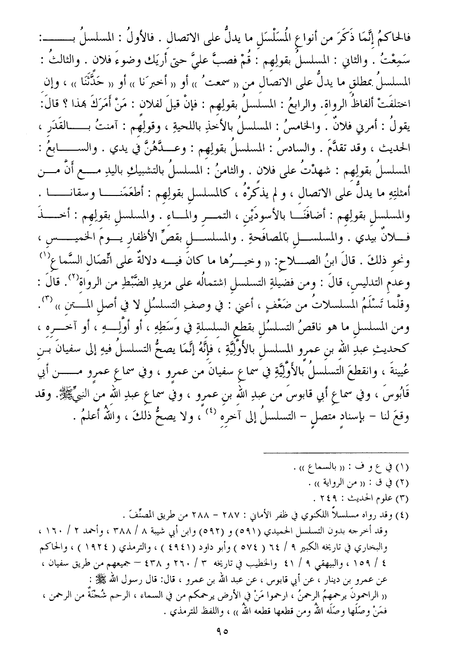فالحاكمُ إِنَّمَا ذَكَرَ من أنواعِ المُسَلْسَلِ ما يدلُّ على الاتصالِ. فالأولُ: المسلسلُ بـ: سَمِعْتُ. والثاني: المسلسلُ بقولِهِم: قُمْ فصبَّ عليَّ حتى أريَك وضوءَ فلانٍ. والثالثُ: المسلسلُ بمطلقِ ما يدلُّ على الاتصالِ من ((سمعتُ)) أو ((أخبرَنا)) أو ((حَدَّثَنَا)) ، وإنِ اختلفَتْ ألفاظُ الرواةِ. والرابعُ: المسلسلُ بقولِهِم: فإنْ قيلَ لفلانٍ: مَنْ أَمَرَكَ بهذا؟ قالَ: يقولُ: أمرني فلانٌ. والخامسُ: المسلسلُ بالأخذِ باللحيةِ، وقولِهِم: آمنتُ بالقَدَرِ، الحديث، وقد تقدَّمَ. والسادسُ: المسلسلُ بقولِهِم: وعدَّهُنَّ في يدي. والسابعُ: المسلسلُ بقولِهِم: شهدْتُ على فلانٍ. والثامنُ: المسلسلُ بالتشبيكِ باليدِ مع أَنَّ من أمثلتِهِ ما يدلُّ على الاتصالِ، ولم يذكرْهُ، كالمسلسلِ بقولِهِم: أطعَمَنا وسقانا. والمسلسلِ بقولِهِم: أضافَنَا بالأسودَيْنِ، التمرِ والماءِ. والمسلسلِ بقولِهِم: أخذَ فلانٌ بيدي. والمسلسلِ بالمصافَحةِ. والمسلسلِ بقصِّ الأظفارِ يومَ الخميسِ، ونحوِ ذلكَ. قالَ ابنُ الصلاحِ: ((وخيرُها ما كانَ فيه دلالةٌ على اتِّصَالِ السَّماعِ وعدمِ التدليسِ، قالَ: ومن فضيلةِ التسلسلِ اشتمالُه على مزيدِ الضَّبْطِ من الرواةِ. قالَ: وقلَّما تَسْلَمُ المسلسلاتُ من ضَعْفٍ، أعني: في وصفِ التسلسُلِ لا في أصلِ المتنِ)) .