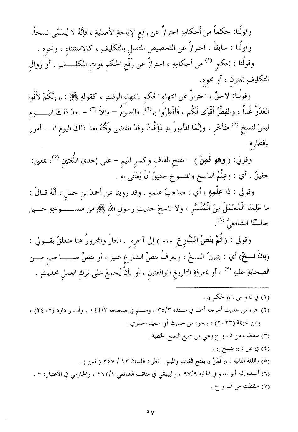 وقولُنا: حكماً من أَحكامِهِ احترازٌ عن رفعِ الإباحةِ الأصليةِ، فإنَّهُ لا يُسَمَّى نسخاً.
