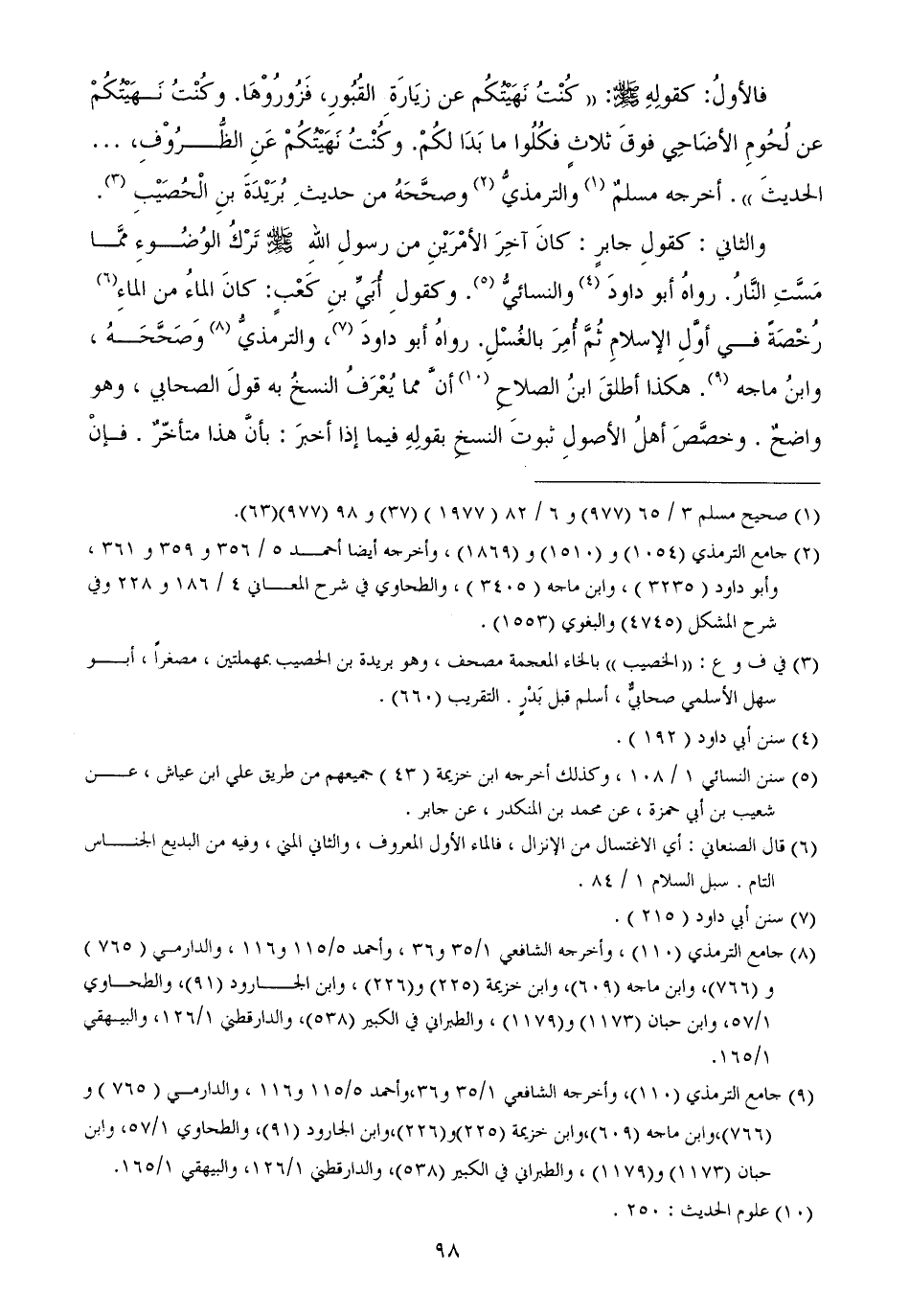 فالأولُ كقولِهِ - صَلَّى اللهُ عَلَيْهِ وَسَلَّمَ - كُنْتُ نَهَيْتُكُم عن زيَارَةِ القُبُورِ، فَزُورُوْهَا وكُنْتُ نَهَيْتُكُمْ عن لُحُومِ الأضَاحِي فوقَ ثلاثٍ فكُلُوا ما بَدَا لكُمْ وكُنْتُ نَهَيْتُكُمْ عَنِ الظُّرُوْفِ، ... الحديثَ أخرجه مسلمٌ والترمذيُّ وصحَّحَهُ من حديثِ بُرَيْدَةَ بنِ الْحُصَيْبِ
