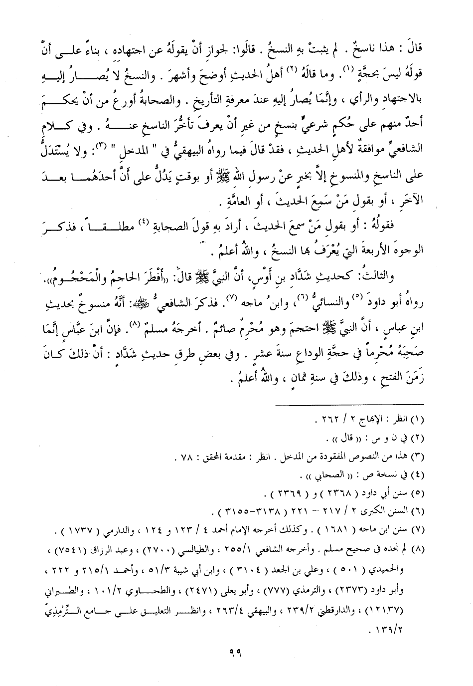 والثالثُ كحديثِ شَدَّادِ بنِ أَوْسٍ، أنَّ النبيَّ - صَلَّى اللهُ عَلَيْهِ وَسَلَّمَ - قالَ أَفْطَرَ الحاجِمُ والْمَحْجُومُ رواهُ أبو داودَ والنسائيُّ، وابنُ ماجه فذكرَ الشافعيُّ - رضي الله عنه - أنَّهُ منسوخٌ بحديثِ ابنِ عباسٍ، أنَّ النبيَّ - صَلَّى اللهُ عَلَيْهِ وَسَلَّمَ - احتجمَ وهو مُحْرِمٌ صائمٌ أخرجَهُ مسلمٌ فإنَّ ابنَ عبَّاسٍ إنَّمَا صَحِبَهُ مُحْرِماً في حجَّةِ الوداعِ سنةَ عشرٍ. وفي بعضِ طرقِ حديثِ شَدَّادٍ: أنَّ ذلكَ كانَ زَمَنَ الفتحِ، وذلكَ في سنةِ ثمانٍ، واللهُ أعلمُ.