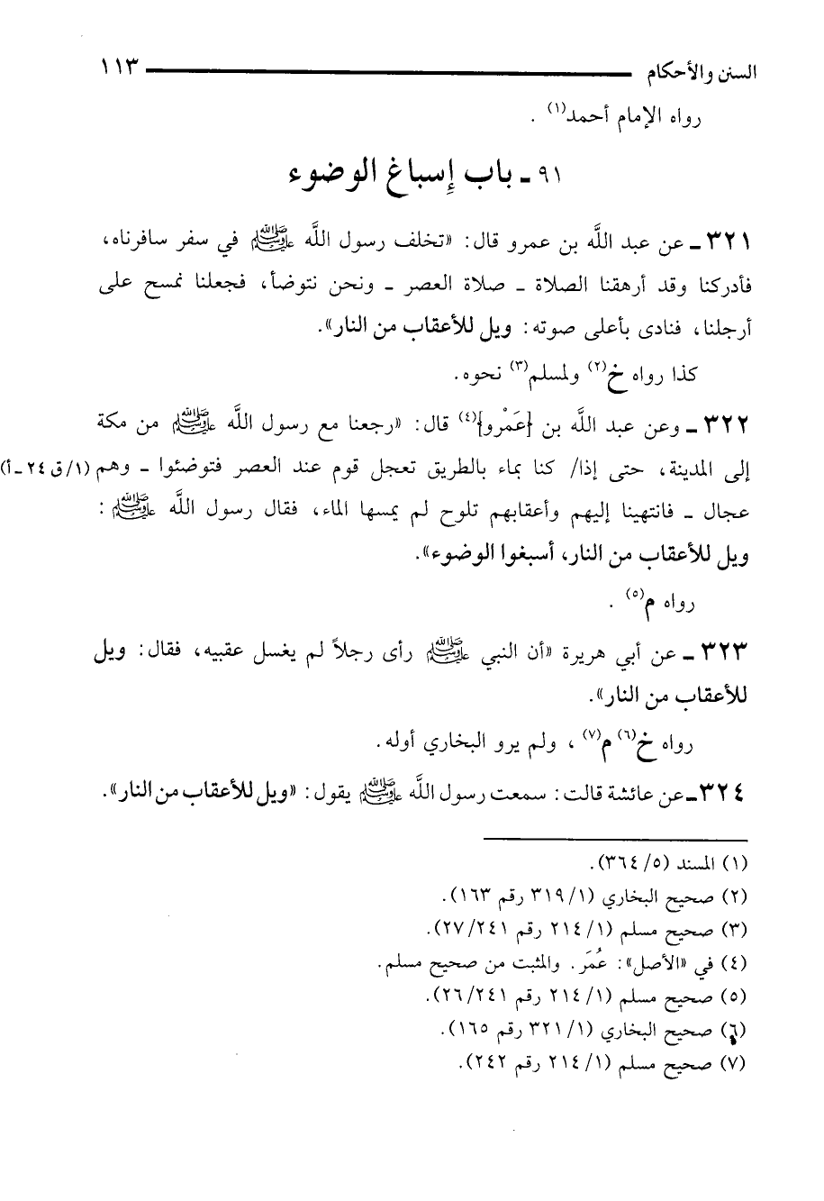 321 - عن عبد الله بن عمرو قال: "تخلف رسول الله - صلى الله عليه وسلم - في سفر سافرناه، فأدركنا وقد أرهقنا الصلاة -صلاة العصر- ونحن نتوضأ، فجعلنا نمسح على أرجلنا، فنادى بأعلى صوته: ويل للأعقاب من النار".