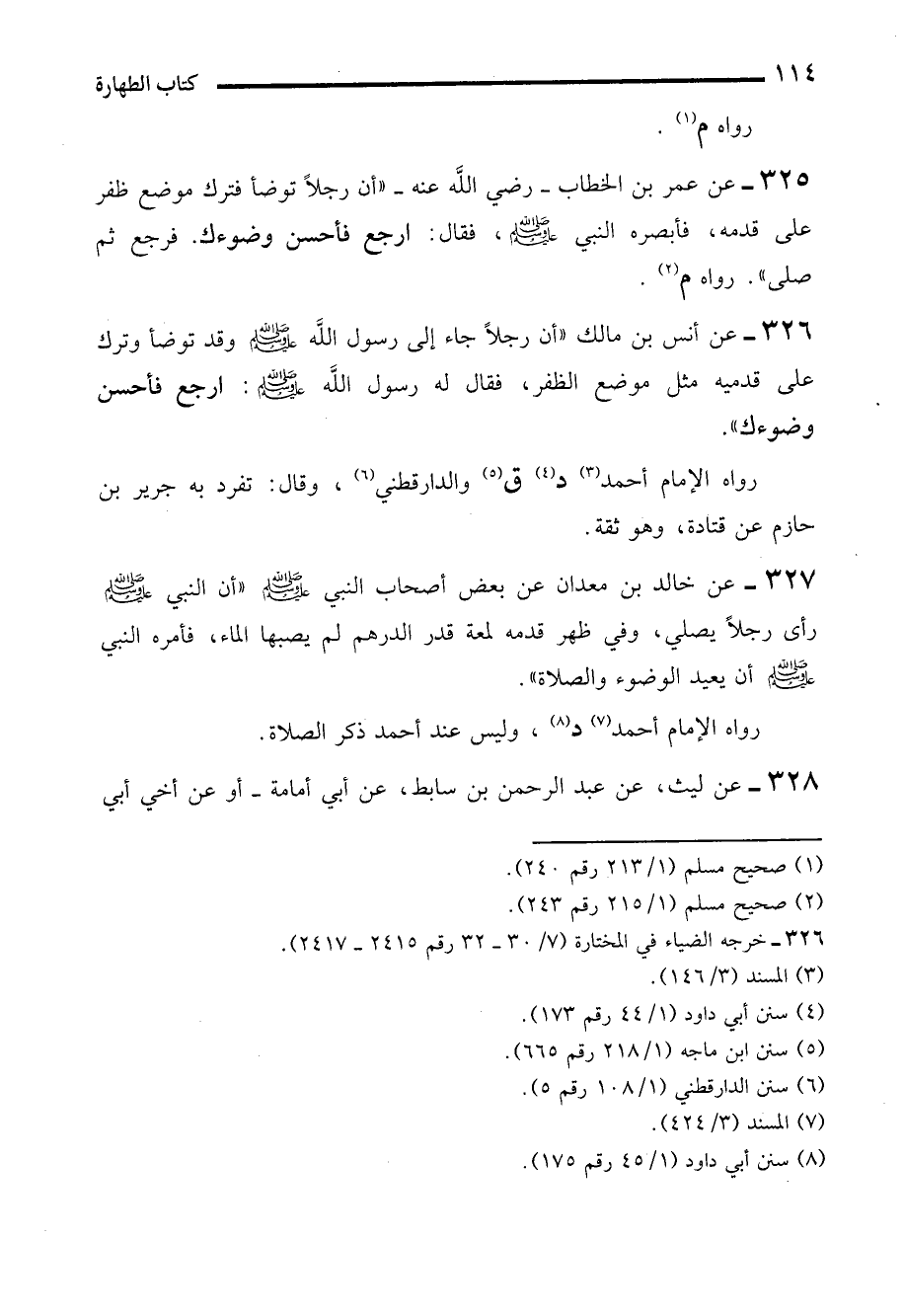 326 - عن أنس بن مالك "أن رجلاً جاء إلى رسول الله - صلى الله عليه وسلم - وقد توضأ وترك على قدميه مثل موضع الظفر، فقال له رسول الله - صلى الله عليه وسلم -: ارجع فأحسن وضوءك".